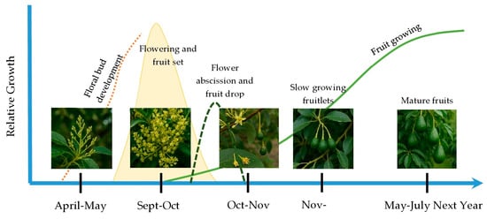 Avocado crop flowering and fruit growing stages at different times of year for Belvedere avocado orchards in Tzaneen, South Africa. The illustrations were created using the grower’s data with modifications from the avocado crop cycle [6].