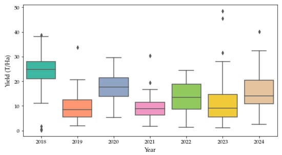 Variation in annual yield in different years or seasons for Belvedere avocado orchards (46 orchards) in Tzaneen, South Africa. Boxes show the interquartile range, the line indicates the median, whiskers represent 1.5× IQR, and points beyond the whiskers are outliers.