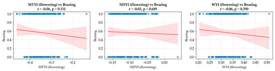 The VIs are effective tools for monitoring canopy vigor and general plant health; however, they often fall short in capturing reproductive phenology, such as flowering and fruit set, which are central to understanding AB in perennial crops like avocado (Persea americana) [11,25]. Given the central role of reproductive development in AB, integrating flowering sensitive spectral indices provides an opportunity to enhance remote sensing-based detection of “on” year and “off” year crops in avocado orchards. Recent advancements in spectral analysis have led to the development of flowering-sensitive indices that focus on the optical properties of flowers, including their color, reflectance, and structural differences relative to foliage. The Weighted Yellowness Index (WYI) is specifically designed to enhance the detection of flowering by assigning greater weight to spectral bands associated with floral signals, while minimizing the contribution of bands dominated by chlorophyll and vegetation greenness [26]. The Normalized Difference Yellowness Index (NDYI) utilizes reflectance in the green and blue wavelengths to distinguish inflorescence areas from the surrounding canopy, offering an effective means of separating reproductive structures from vegetative background [27]. The Mango tree Yellowness Index (MTYI) serves as another flowering sensitive index that captures the yellow spectral response observed in flowering tree canopies and has shown promise in representing reproductive phenology in tropical fruit trees [26]. The integration of flowering indices (FIs) with traditional VIs offers a more holistic view of both vegetative and reproductive processes in avocado orchards. This is particularly valuable for detecting alternations between “on” year and “off” year cycles, where the extent of flowering and subsequent fruit retention following early fruit drop serve as critical indicators of AB behavior [25,28].