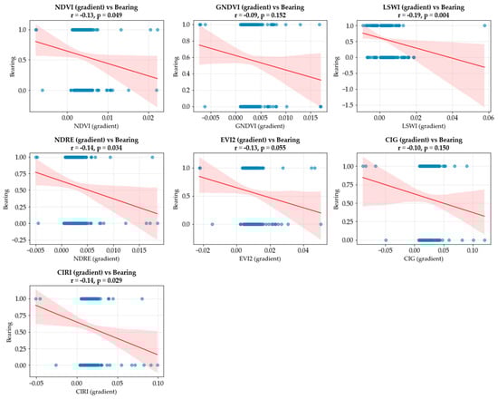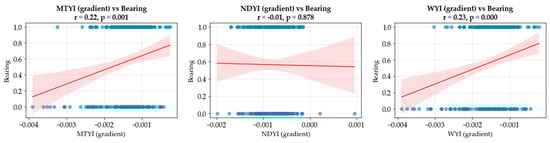 - Temporal Gradient—The rate of change between the two above stages was calculated to capture sharp declines in FIs or distinct peaks in VIs, serving as strong indicators of “on” or “off” years.