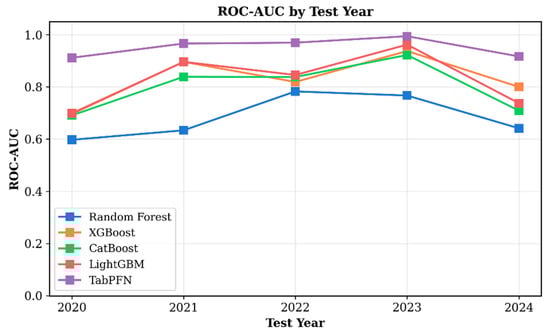 The ML analysis provided further insight into the relative importance of the variables contributing to avocado AB classification. Among the models evaluated, the TabPFN algorithm demonstrated the highest predictive accuracy and temporal stability. This performance can be attributed to its ability to incorporate probabilistic priors and capture nonlinear interdependencies between phenological, spectral, and climatic predictors. Ensemble tree-based models such as Random Forest and XGBoost achieved moderate performance, whereas LightGBM and CATBoost performed slightly better, likely due to their enhanced handling of categorical data and imbalanced classes. However, the superior performance of TabPFN (Accuracy = 0.88; AUC = 0.95) suggests that probabilistic transformer-based frameworks are particularly well suited for time-dependent agricultural systems with limited and noisy training data. Its robustness during “off” years, where most other models showed reduced accuracy, further confirmed its capacity for generalization under varying environmental conditions.
