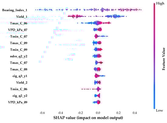 The feature importance results from TabPFN identified previous-year yield and bearing index as dominant predictors, followed by climatic variables and chlorophyll-related indices (CIG and CIRE). This hierarchy emphasized the interconnected influence of historical productivity, physiological status, and environmental conditions on yield formation. The strong contribution of chlorophyll-based indices reflected their sensitivity to canopy photosynthetic efficiency, while the relevance of FIs (WYI, NDYI, and MTYI) reinforced the importance of reproductive dynamics during early fruit set. Collectively, these findings confirmed that AB in avocado is driven by an integrated response of physiological, climatic, and spectral factors rather than any single variable. Similar integrative interpretations have been proposed in other perennial crops such as citrus and olive [75,76], supporting the general applicability of the present approach.
