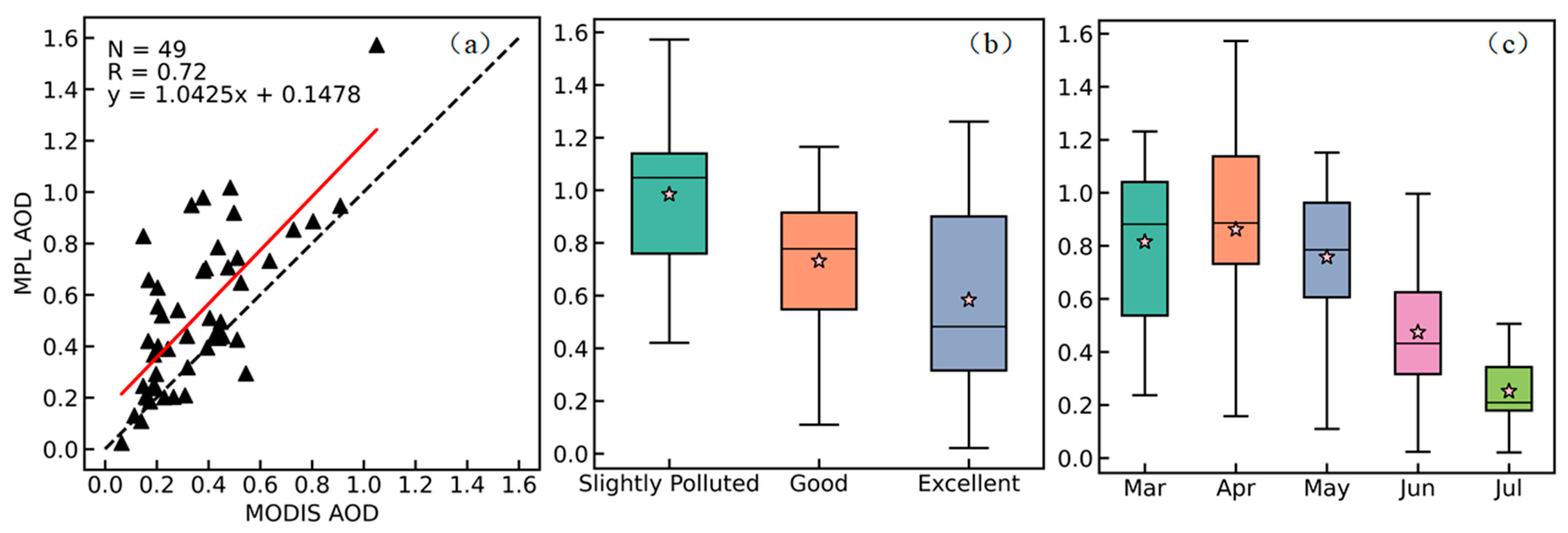 - Zheng, B.; Wu, D.; Li, F.; Deng, T. Changes in the Aerosol Optical Properties in Guangzhou under the South China Sea Summer Monsoon. J. Trop. Meteorol. 2013, 29, 207–214. (In Chinese) [Google Scholar]