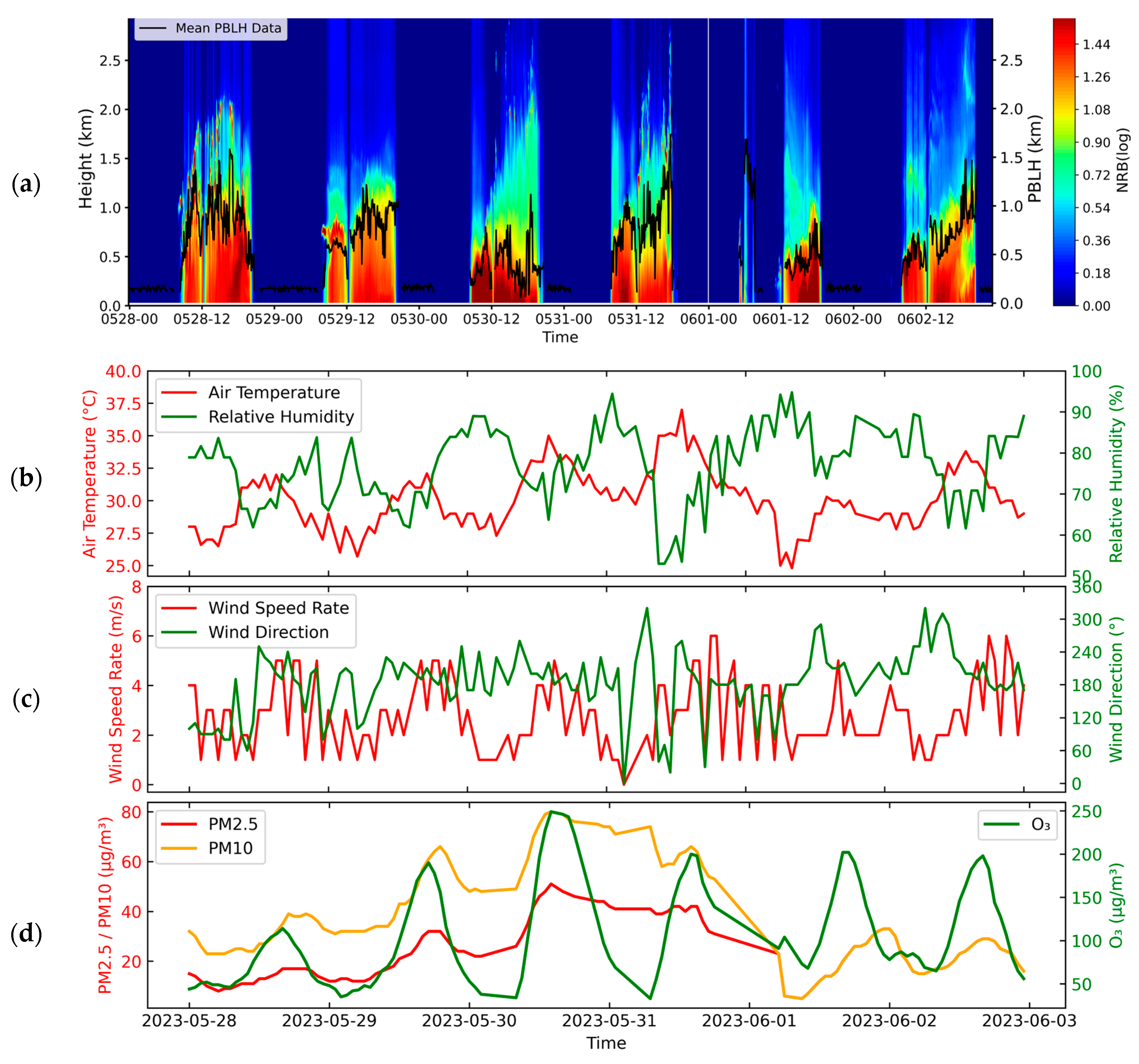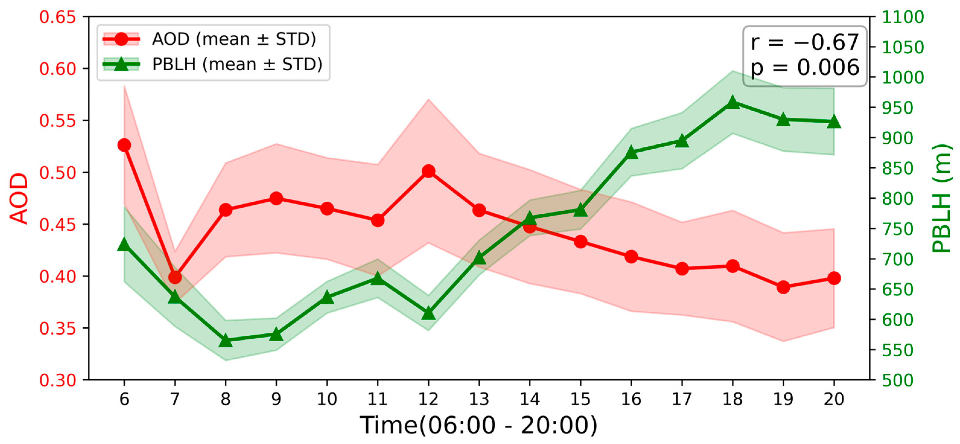 - During the observation period, Shenzhen’s PBLH characteristics exhibited significant diurnal variation and high sensitivity to pollution, the daytime mean PBLH ranged from approximately 512 to 1345 m, while nighttime values generally decreased to around 500 to 650 m. And under high aerosol loading conditions, PBLH was significantly suppressed to approximately 500 m, indicating that pollution limits atmospheric mixing by inhibiting boundary layer development.