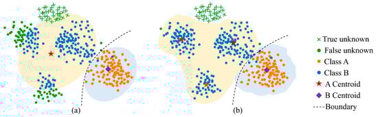 To address this limitation, open-set HSI classification has emerged as a research focus. Unlike closed-set classification, open-set classification explicitly accounts for the presence of unknown classes in the test data and aims to correctly identify samples that do not belong to any of the known categories, while still accurately classifying known classes. Currently, existing studies typically decompose open-set classification problems into two sub-tasks: known classes classification and unknown class identification. Among them, the identification of the unknown class is typically performed using extracted features or classification results of known classes, in combination with methods such as distance-based methods [29,30,31,32,33], reconstruction-based methods [34,35,36], uncertainty-based methods [37,38], and so on [39,40], to assess whether the sample originates from an unknown category. Compared with closed-set classification methods, current open-set oriented HSI classification methods can identify samples outside the set of known classes to a certain extent. However, most discriminative-based open-set classification methods focus primarily on inter-class decision boundaries of known classes, ignoring the limited separability between known and unknown classes caused by the diversity and variability of intra-class distributions, as shown in Figure 1a. In contrast, generative models, such as Variational Autoencoders and the GAN, can better capture the intrinsic structure of data by modeling its underlying distribution, thereby enhancing the capability of unknown sample recognition [41,42,43]. However, in the context of complex intra-class multimodal distributions, standard generative-based open-set recognition methods still fail to accurately capture the full variability within each class.