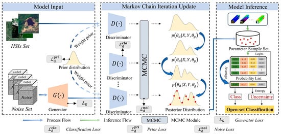 In this section, the proposed GDAN model is described in detail. First, the GAN is reinterpreted from a Bayesian perspective for open-set HSI classification. Then, the GAN and MCMC sampling are integrated within a unified Bayesian framework. Finally, a novel uncertainty-aware criterion is introduced to distinguish unknown samples from known classes. Figure 2 illustrates the structure of the proposed GDAN designed for open-set HSI classification.