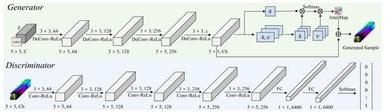 where is the generated samples of the generator , and the noise . To avoid potential model collapse and better explore data distribution pattern, the consists of a three-dimensional random noise cube with class labels , where denotes the number of spectral channels, and indicates the number of classes. Also, denotes the SA mechanism: