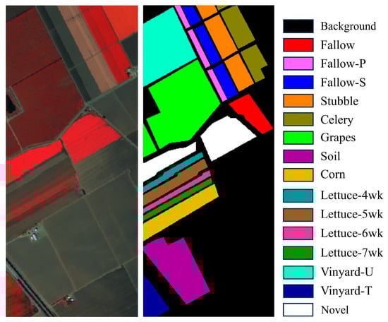 (3) Salinas Valley: This image was collected by the airborne visible infrared imaging spectrometer (AVIRIS) sensor over Salinas Valley, CA, USA. It has a resolution of 512 × 217 pixels, with a spatial resolution of 3.7 m, and includes 224 bands covering the wavelength range from 0.4 to 2.5 . In practice, 20 water absorption bands were removed, leaving 204 bands for analysis. The area contains sixteen distinct land-cover classes. Details of the dataset can be found in Figure 6.