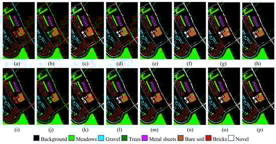 Open-set HSI classification maps for the University of Pavia dataset. (a–h) 100-sample scenario. (i–p) 200-sample scenario. From left to right: HyperMamba, MixerSENet, BDL-, SSLR, SSMLP, HyperTaFOR, FrHSPL, and ours.