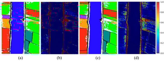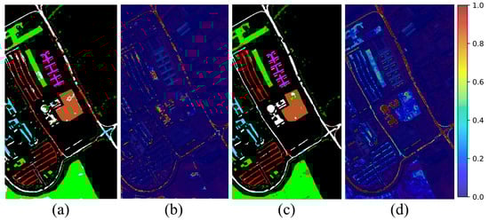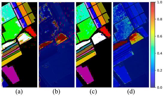 Table 4 and Table 5 further demonstrate that the proposed method consistently surpasses all four advanced open-set HSI classification methods in terms of open-set performance. For the case of T = 100, the proposed method achieves improvements ranging from 0.7% to 8.6% across , , and compared with the competing methods. When the number of training samples increases to T = 200, the method maintains its superiority, yielding gains in the range of 0.3% to 5.7% over the four state-of-the-art baselines. Furthermore, the proposed method consistently surpasses the BNNs-based method BDL- across varying sample proportions. Notably, the proposed method markedly outperforms all leading open-set HSI classification methods in identifying unknown class, with improvements ranging from 9.6% to 34.1% across different sample proportions.