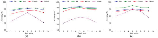 To evaluate the performance of the proposed method against other state-of-the-art methods in open-set HSI classification, three metrics were used: Overall Accuracy (), Average Accuracy (), and Kappa Coefficient ().