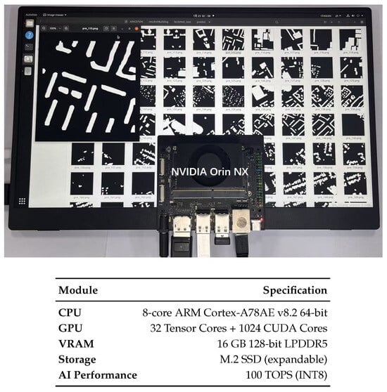 To evaluate the practical deployment efficiency of the proposed model, especially under resource-constrained environments such as UAVs or satellite platforms, we performed edge inference tests on the NVIDIA Jetson Orin NX embedded computing platform (NVIDIA Corp., Santa Clara, CA, USA). The board and its hardware specifications are shown in Figure 2. Typical UAV-mounted or embedded platforms often run under strict resource limits, such as 10–25 W power budgets and 8–16 GB memory. Under such constraints, complex multimodal networks cannot sustain fast and efficient inference, which further motivates the lightweight design of DLiteNet.