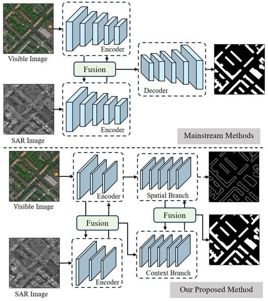 Despite their individual merits, both visible and SAR modalities exhibit inherent limitations in building extraction tasks. Visible images often suffer from spectral confusion between buildings and other artificial structures (e.g., roads), and material diversity within buildings leads to intra-class variability, which undermines classification accuracy [27,28]. In contrast, SAR images lack color and texture cues, resulting in limited structural detail and reduced segmentation quality. To address these issues, recent efforts have focused on fusing visible and SAR modalities. For instance, Li et al. [29] proposed a progressive fusion learning framework to integrate phase characteristics from both modalities for accurate building localization. Zhang et al. [30] further introduced ASANet, an asymmetric semantic aligning network for RGB–SAR land-cover classification, which employs modality-specific feature extraction and cross-modal alignment to enhance multimodal interaction. Zhao et al. [31] applied a complex multimodal fusion pipeline to extract semantic information from visible and multispectral images, followed by refinement using edge-aware priors from visible data.