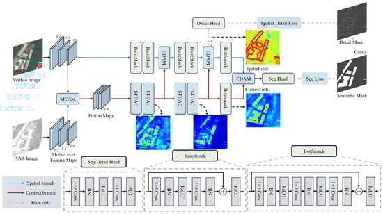 Context Branch: The Context Branch is designed to capture high-level semantic context by aggregating information from both visible and SAR inputs. Visible imagery provides rich texture and structural cues, which are particularly effective for recognizing building outlines. In contrast, SAR imagery offers strong backscattering responses from vertical surfaces, making it especially sensitive to building facades and other man-made structures. To efficiently integrate this complementary information, we propose the Multi-modal Context Attention Module (MCAM) for balancing and fusing visible and SAR contexts. In addition, we design a lightweight multi-scale context extractor, the Short-Term Dense Atrous Concatenate (STDAC) module, which enables efficient multi-scale semantic aggregation with minimal computational overhead. For comparative evaluation and baseline strengthening, we also incorporate a standard Bottleneck module from ResNet [34], which facilitates deeper feature representation via residual learning. As shown by the intermediate feature maps (indicated by black dashed lines in Figure 4, this branch accurately captures the global layout and semantic boundaries of buildings.
