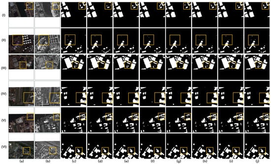 Figure 9. Building extraction results on the MSAW dataset. The yellow boxes highlight the zoom-in regions of interest (ROIs) that are further analyzed in the subsequent discussion. The labels I, II, III, IV, V, and VI correspond to six representative scenes selected from the dataset. (a) Visible image. (b) SAR image. (c) Ground Truth. (d) U-Net (Visible). (e) DeepLabv3+ (Visible). (f) HRNet (Visible). (g) DeepLabv3+ (SAR). (h) MCANet. (i) SA-Gate. (j) DLiteNet (Ours).