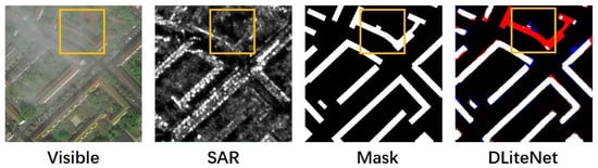Figure 12. Representative failure case of DLiteNet under dense fog conditions. The yellow box highlights the region where the model fails due to severe occlusion in the visible image and weak or ambiguous backscatter in the SAR channel. This results in missing part of the building footprint within the highlighted area, illustrating the limitation of the model when both modalities are simultaneously degraded.