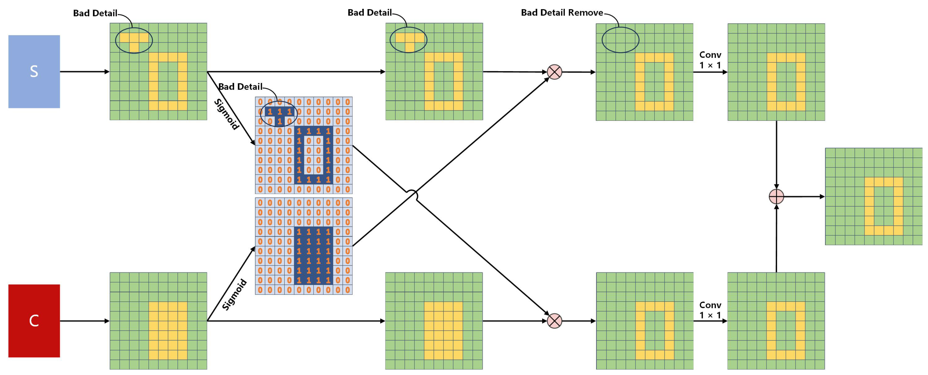 where σ ( · ) denotes the Sigmoid function, and ⊙ represents element-wise multiplication. This operation allows the network to adaptively select complementary context features from both modalities.
