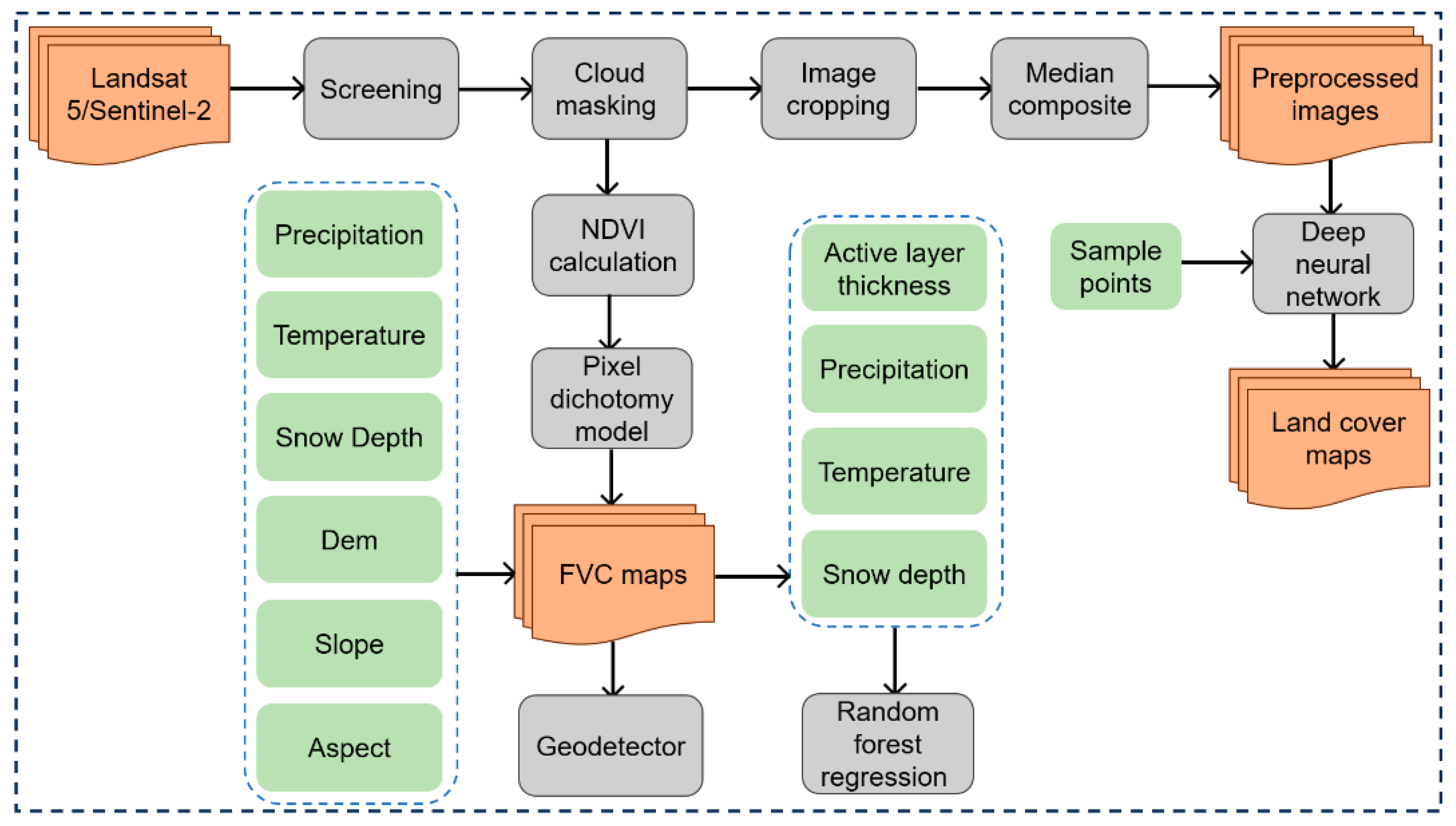 - Based on geographical detector analysis, we reveal that precipitation, elevation, and temperature have considerable influence on the spatial differentiation of vegetation coverage in the TRH region. The thickening of the active layer of the permafrost and precipitation contribute substantially to the increase in vegetation coverage.