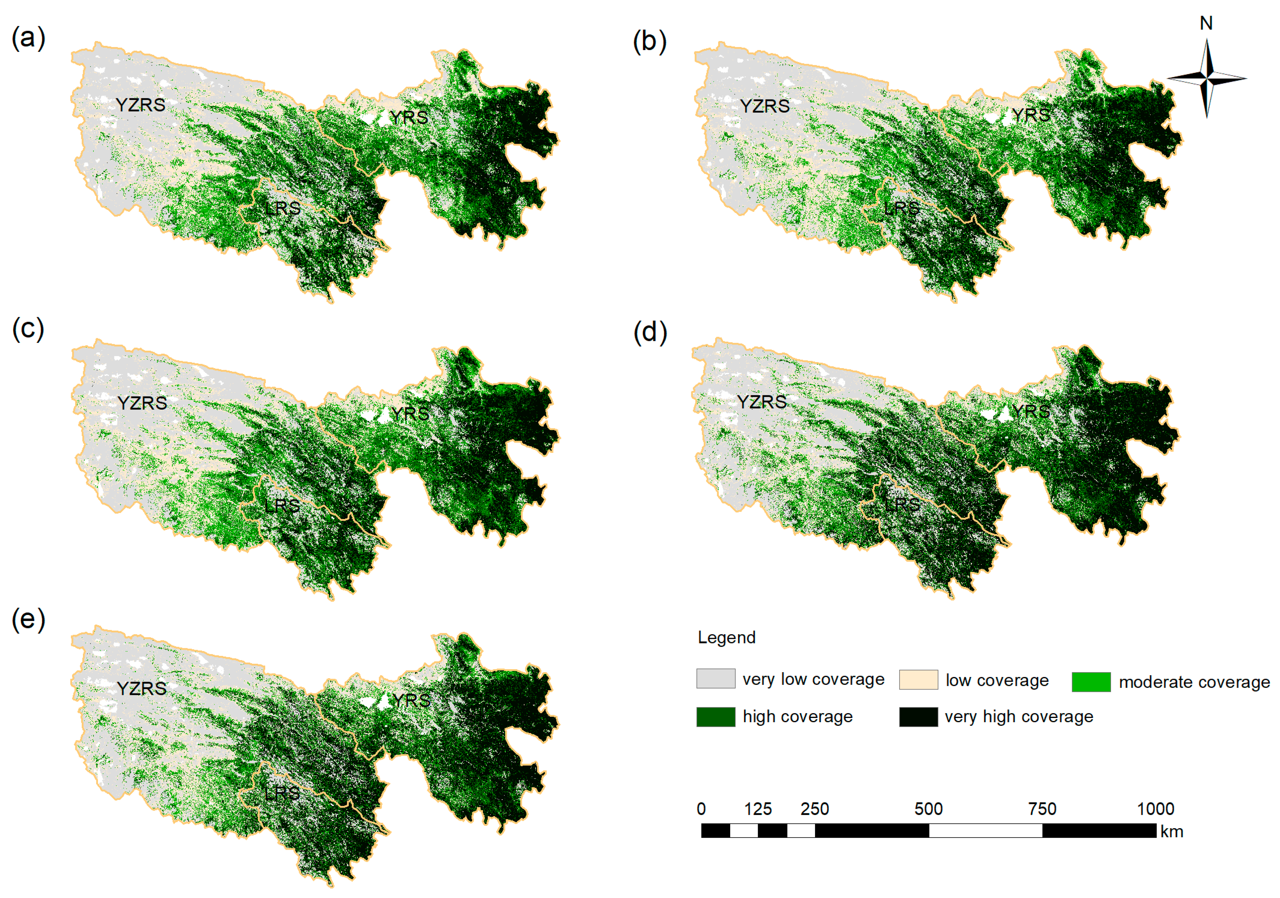 - Qiu, F.; Yao, Y.; Li, Y.; Yu, R.; Fan, J.; Zhang, X.; Kan, Y.; Liu, L.; Xie, Z.; Ning, J.; et al. Satellite-Derived Spatiotemporal Dynamics of Vegetation Cover and Its Driving Factors in the Three-River Headwaters Region from 2001 to 2022. Remote Sens. 2025, 17, 1187. [Google Scholar] [CrossRef]