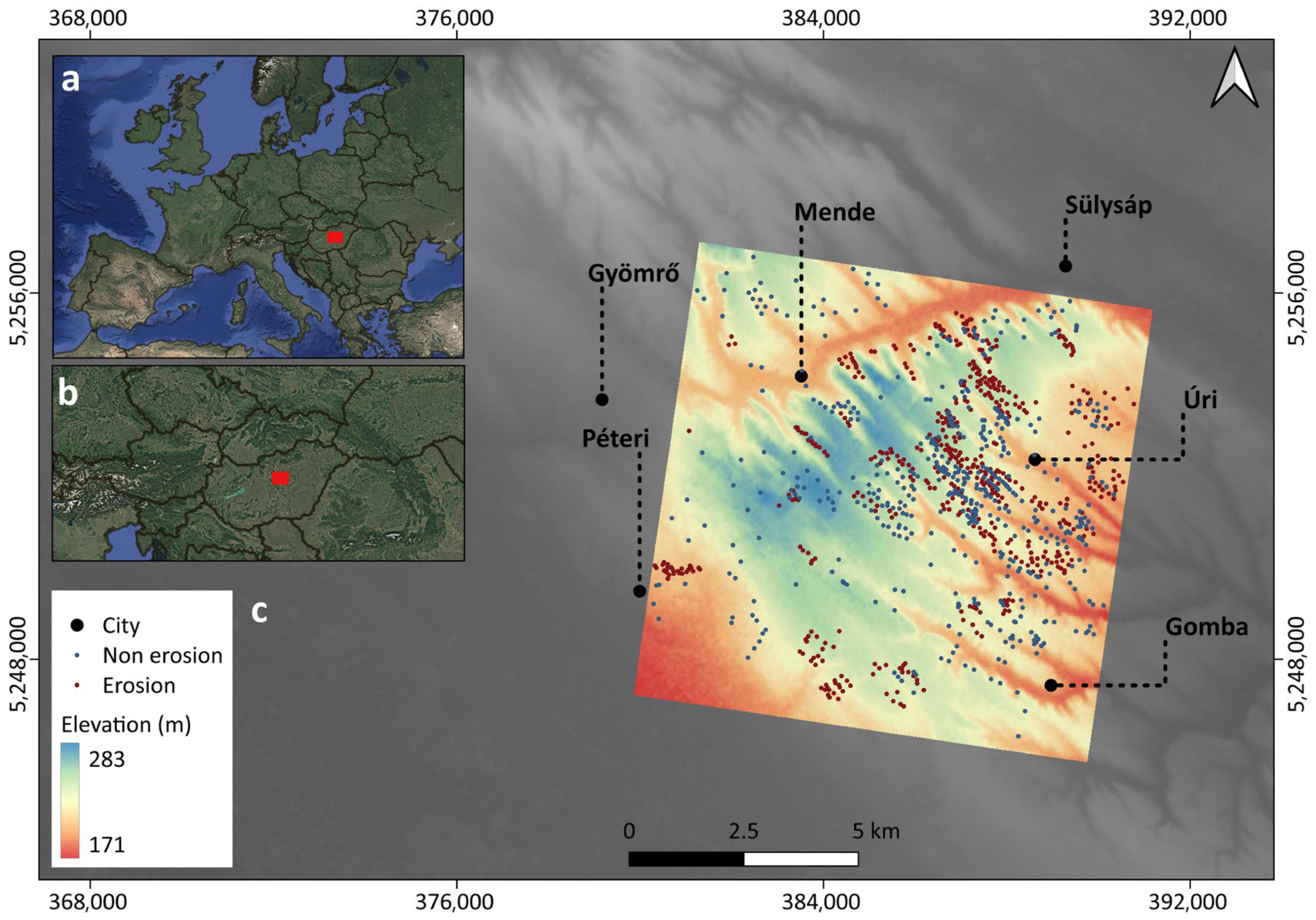 | Lithology | Hungarian Geological Database/1:100,000 | Loess, Rivers sand, Fluvioeolian sand, fluvial siltstone/Categorical | Controls erodibility & permeability |