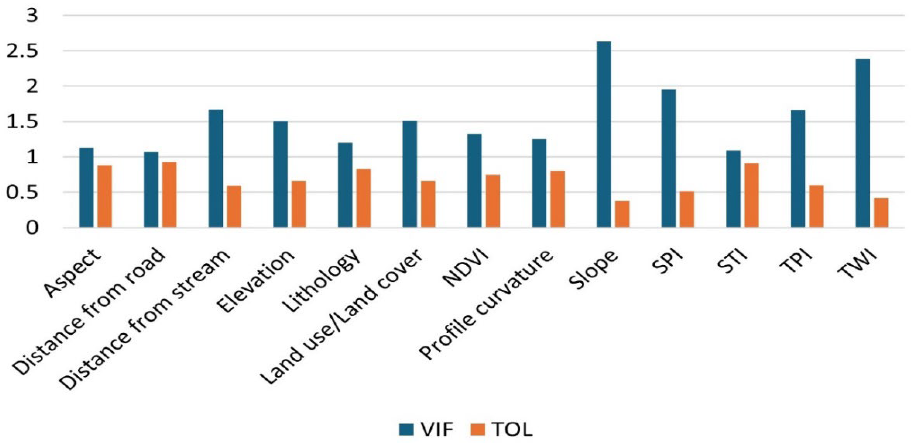5.1. Assessment of Multicollinearity Among the Geo-Environmental Factors