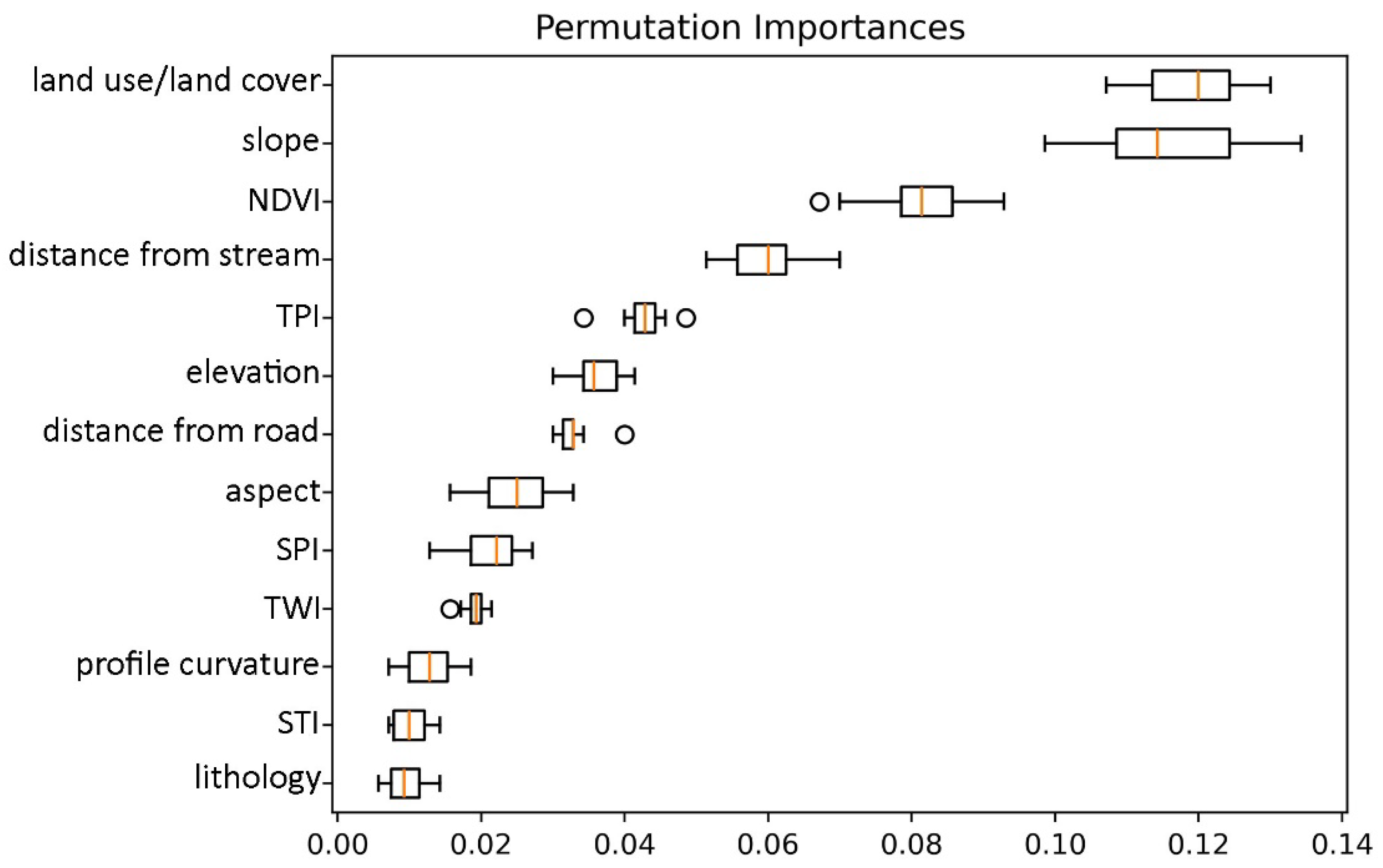 | Topographic wetness index (TWI) | Derived from DEM/12.5 m | 3.26–21.46/Continuous | Represents potential water accumulation |