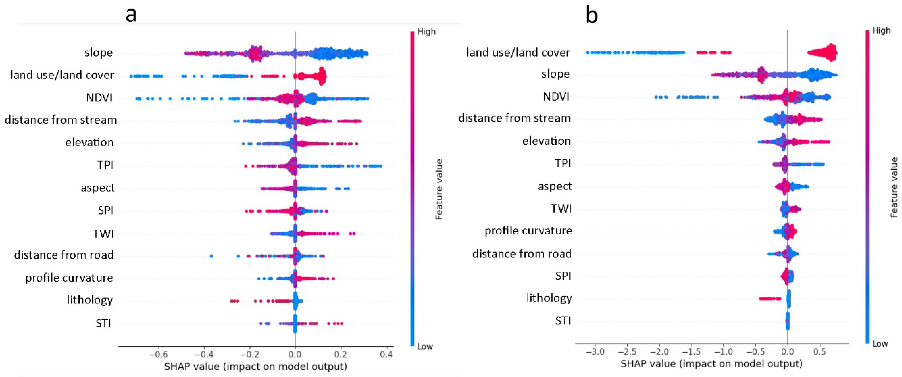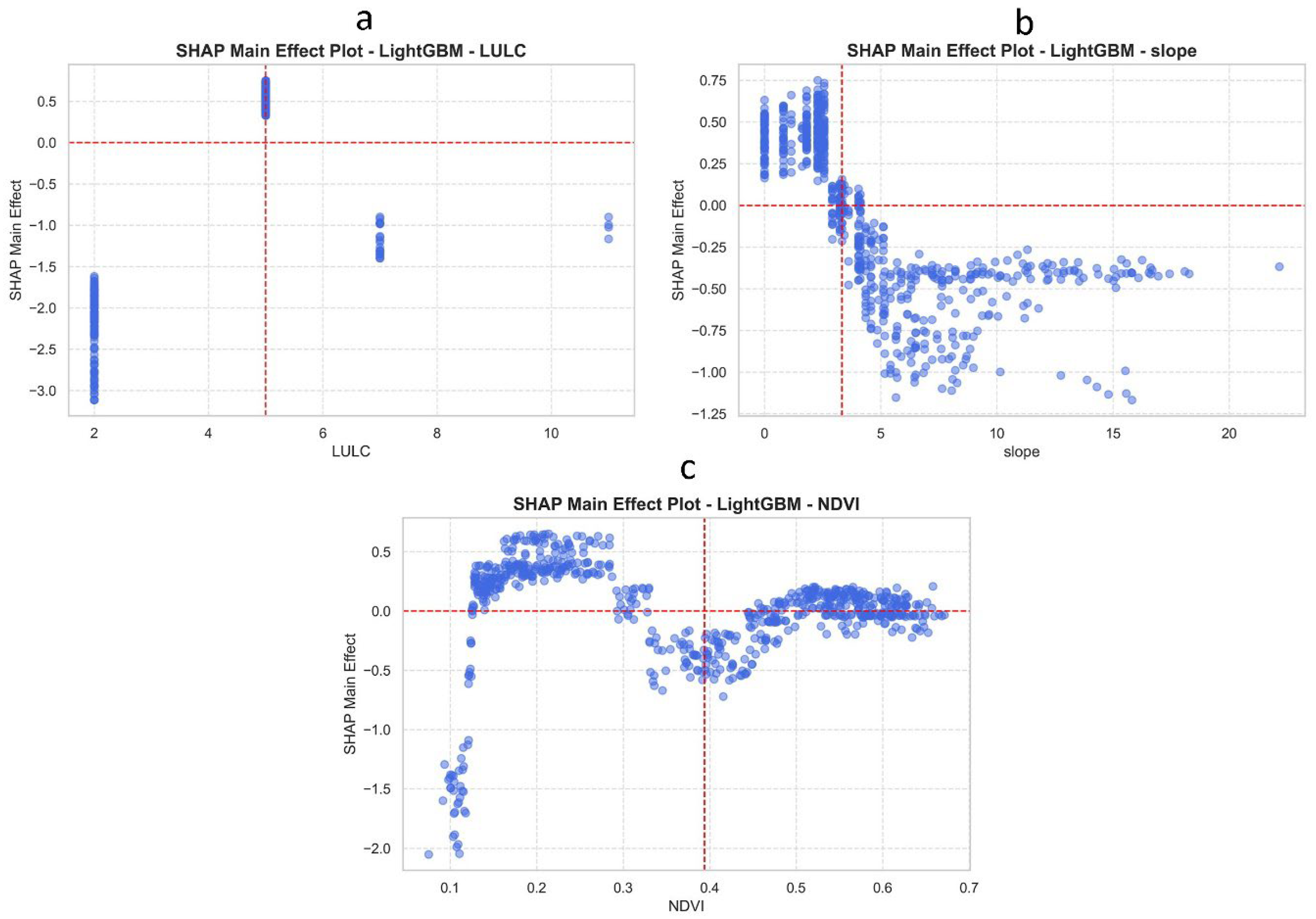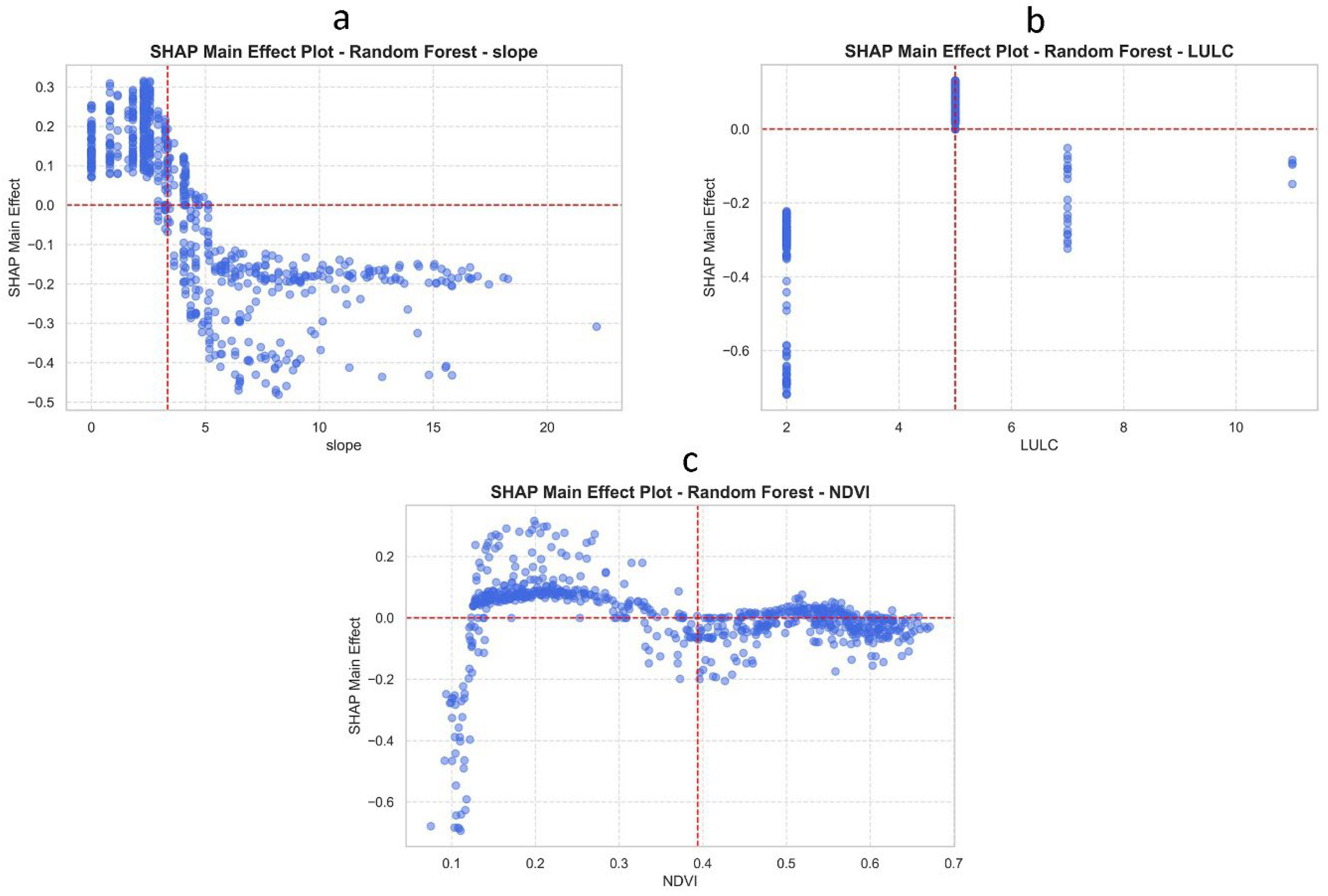 - Shapley Additive Explanation (SHAP) summary and main effect analyses revealed that slope, land use/land cover (LULC), and Normalized Difference Vegetation Index (NDVI) are the dominant drivers of erosion, providing interpretable insights into the mechanisms influencing soil loss.