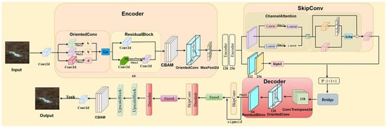 The generator is built upon a deeply customized U-Net [34], referred to as the Enhanced U-Net. This architecture incorporates several strategic enhancements tailored to the characteristics of remote sensing images. As shown in Figure 3, the encoder–decoder framework employs a three-level hierarchical structure to systematically extract, refine, and reconstruct multi-scale features. The encoder pathway progressively transforms input features using directional convolution modules that capture geometrically meaningful patterns, supported by residual blocks to maintain stability during the training of deep networks. A key innovation is the replacement of standard skip connections with an adaptive fusion mechanism. This mechanism dynamically balances the contribution of features from different abstraction levels, allowing selective enhancement of encoder features before they are integrated with corresponding decoder features. This ensures optimal use of multi-scale information throughout the reconstruction process.