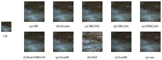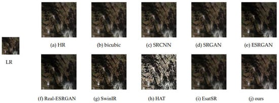 As quantified in Table 2, the proposed MAF-GAN achieved a PSNR of 27.14 dB, an SSIM of 0.7206, an LPIPS of 0.1017, a SAM of 1.0871, and an inference time of 24.51 ms. Among the compared methods, these values represent the highest recorded PSNR and SSIM, and the lowest LPIPS. The inference time of the proposed method was lower than that of SRGAN (36.10 ms), Real-ESRGAN (46.62 ms), SwinIR (42.30 ms), and HAT (86.04 ms), and was comparable to ESRGAN (23.54 ms) and ESatSR (22.65 ms). With 16.93 million parameters, the model’s parameter count was similar to SRGAN (16.70 M) and Real-ESRGAN (16.70 M), lower than ESRGAN (48.60 M) and ESatSR (23.76 M), and higher than SwinIR (11.80 M) and HAT (13.94 M).