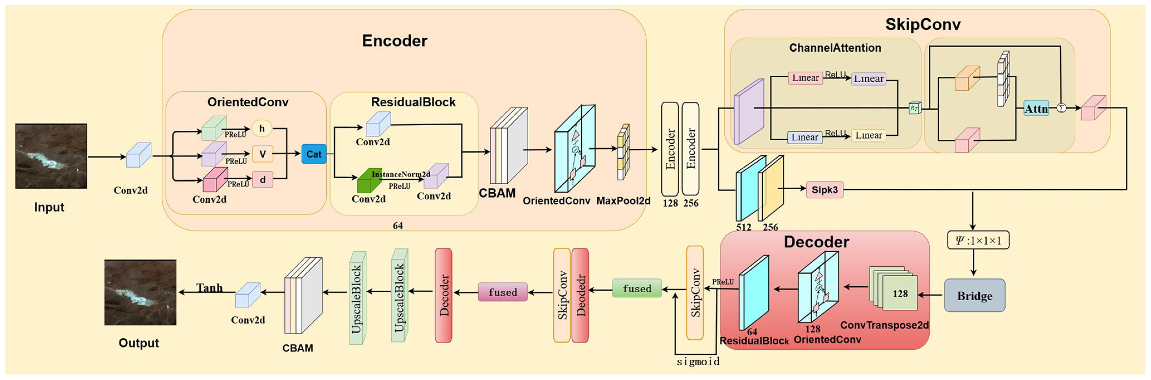 - Oriented Convolution Module: To directly enhance the model’s capability for reconstructing anisotropic features, we introduce the Oriented Convolution Module. This module moves beyond the isotropic filtering of standard convolutions by decomposing the feature extraction process into three orientation-specific pathways: horizontal (3 × 1 kernel), vertical (1 × 3 kernel), and diagonal (3 × 3 kernel). This targeted approach ensures that fine linear structures are amplified and preserved without being diluted by responses from irrelevant directions. A key innovation is our adaptive channel allocation strategy, which dynamically configures the network’s representational resources. Recognizing that horizontal and vertical edges are predominant in man-made and natural landscapes, we prioritize them by allocating max(1, out_channels//4) channels to each, granting them sufficient capacity. The diagonal branch, serving as a complementary capture for complex contours, utilizes the remainder. Learnable non-linearity via PReLU is incorporated per branch for refined feature transformation. The concatenation of these specialized outputs yields a powerful, direction-enriched feature set that is critical for high-fidelity reconstruction of geometric details.