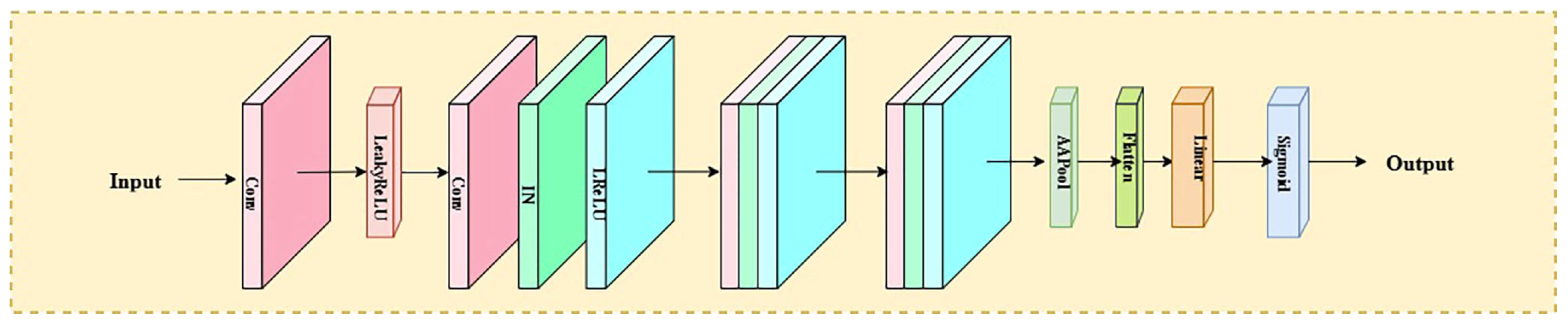 - Residual Block with Instance Normalization: Each block contains two convolutional layers, each followed by Instance Normalization and PReLU activation. Adaptive shortcut connections (using 1 × 1 convolution when channel dimensions differ, otherwise identity) enable complex transformations while preserving gradient flow.