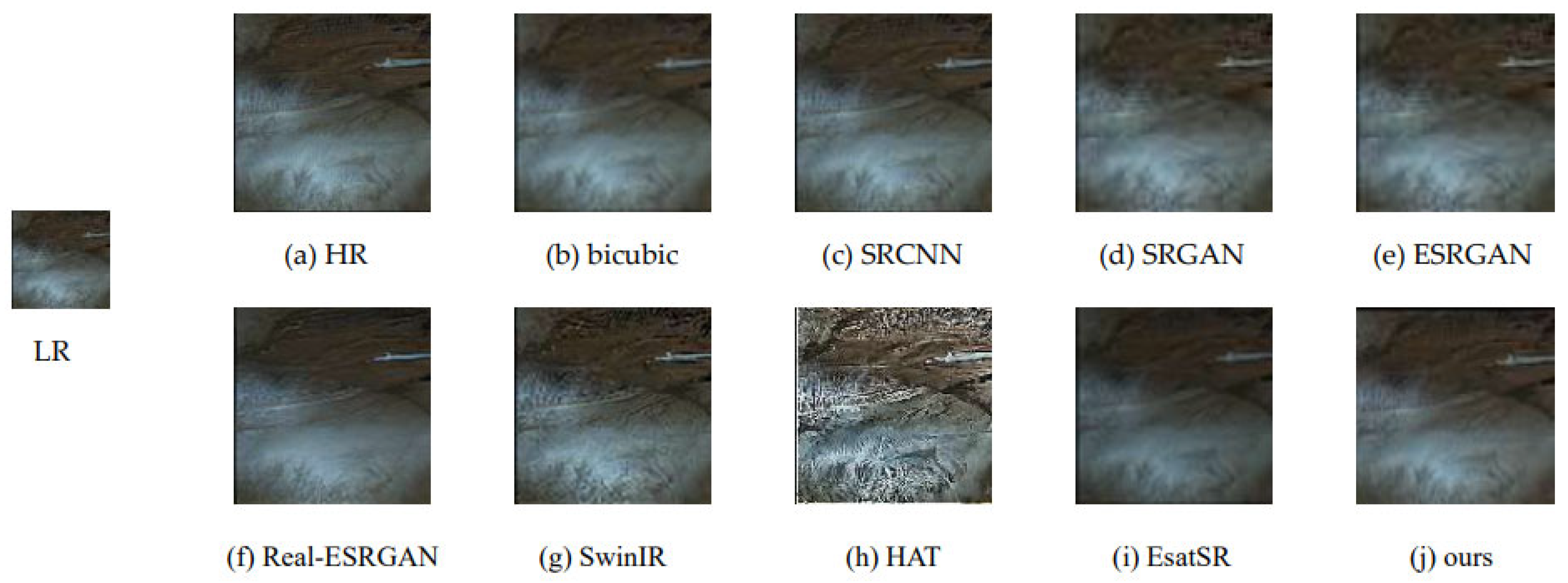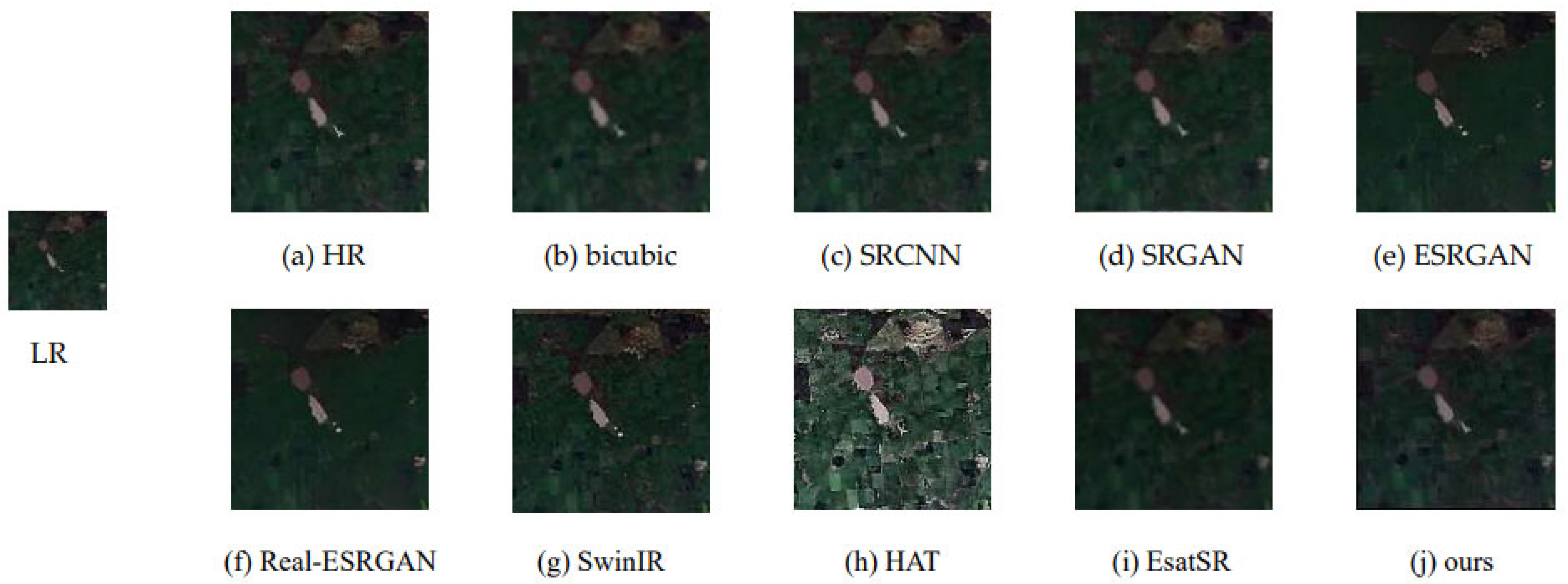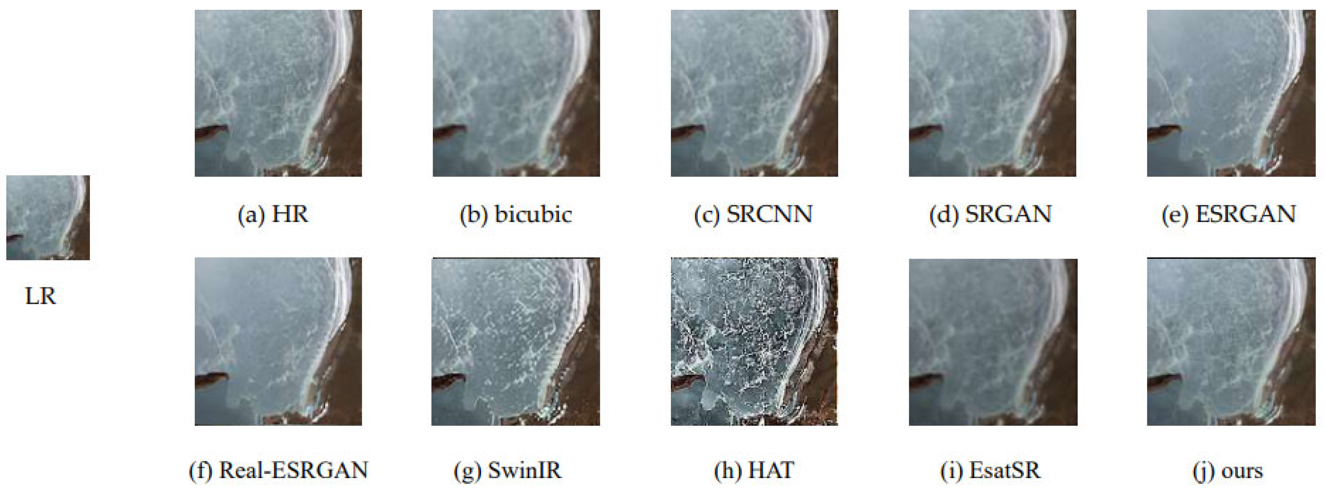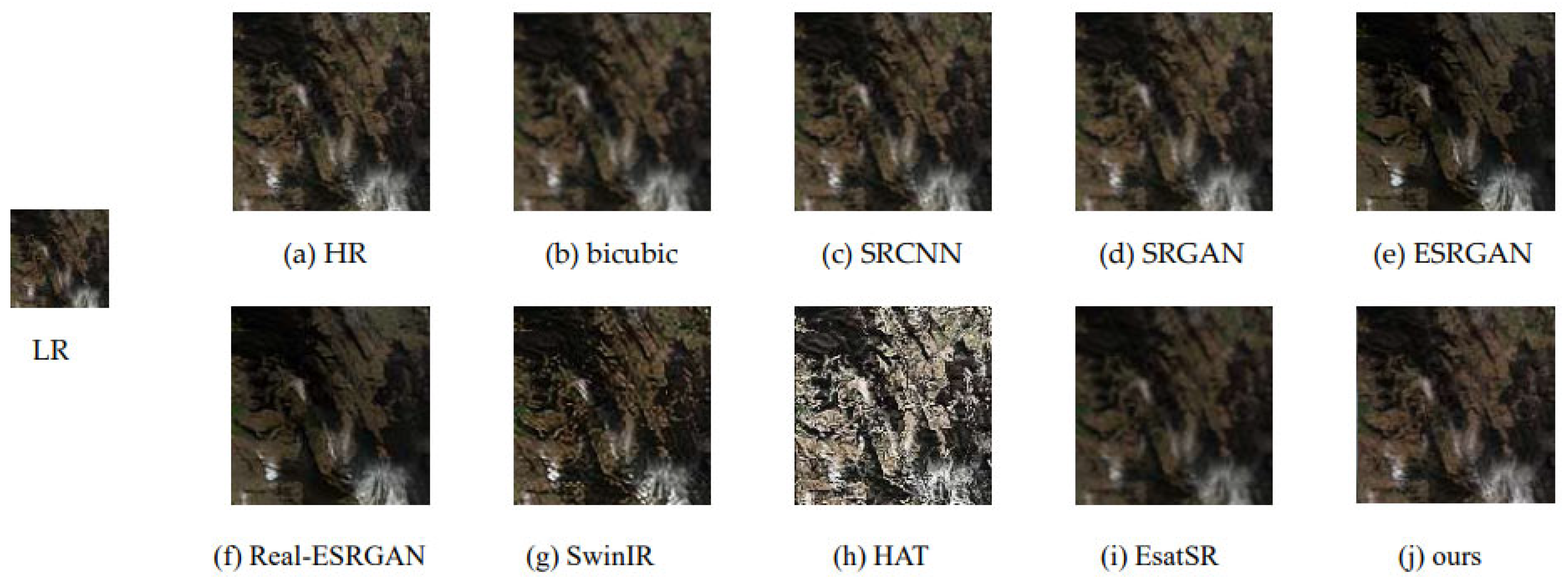 - Wang, Y.; Yuan, W.; Xie, F.; Lin, B. ESatSR: Enhancing Super-Resolution for Satellite Remote Sensing Images with State Space Model and Spatial Context. Remote Sens. 2024, 16, 1956. [Google Scholar] [CrossRef]