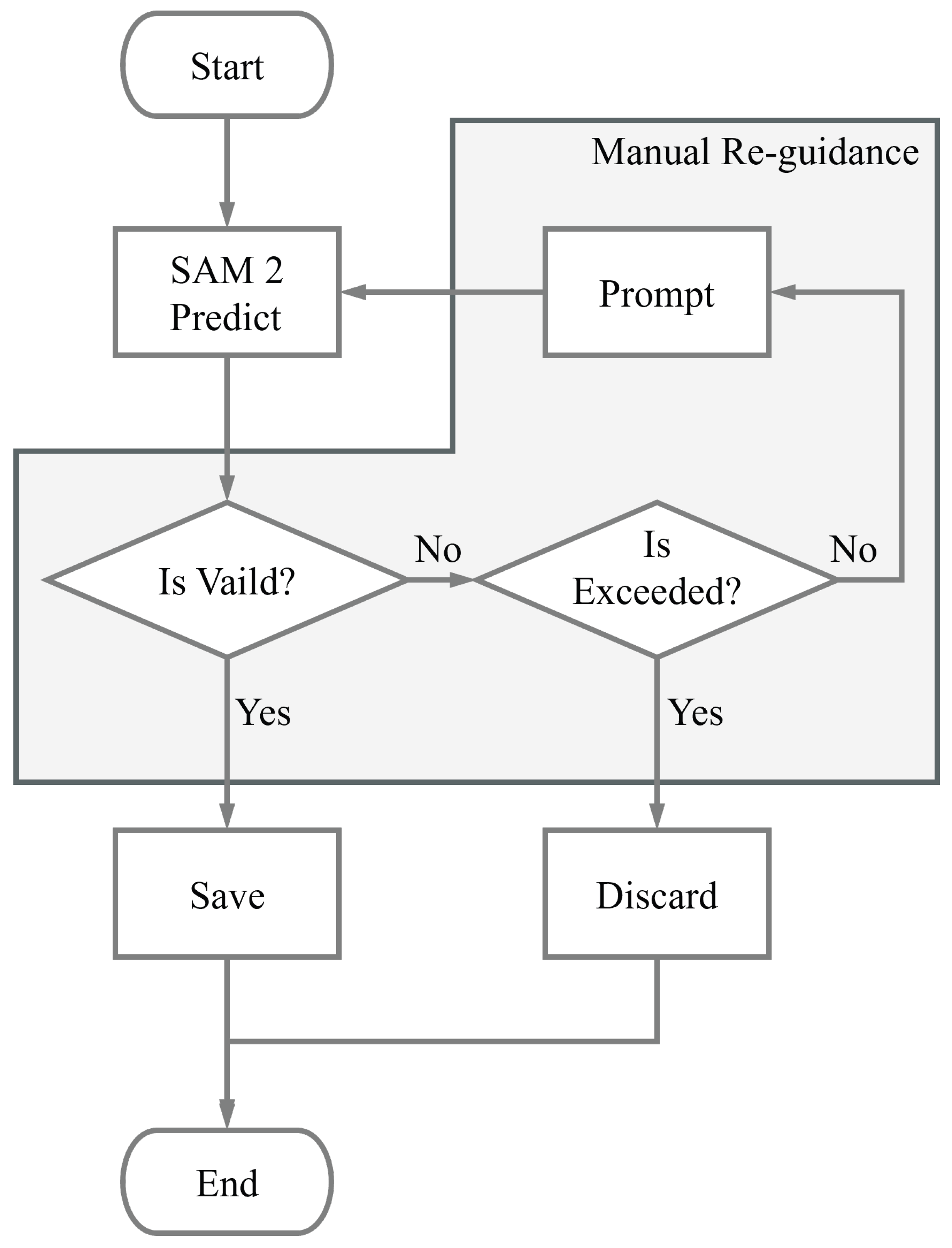 - These masks undergo manual screening to select effective ones; if all three are invalid, manual re-guidance is implemented. This re-guidance involves adding a point prompts to any of the previously generated masks, including positive points which indicating areas to retain and negative points which indicating areas to discard. Sam2.1-hiera-large takes the manually added points, original bounding box, and previously generated mask as prompts to generate new masks. This manual re-guidance process can be executed multiple times until an effective mask is obtained. If too many re-guidance attempts still fail to produce a valid mask, the instance is discarded.