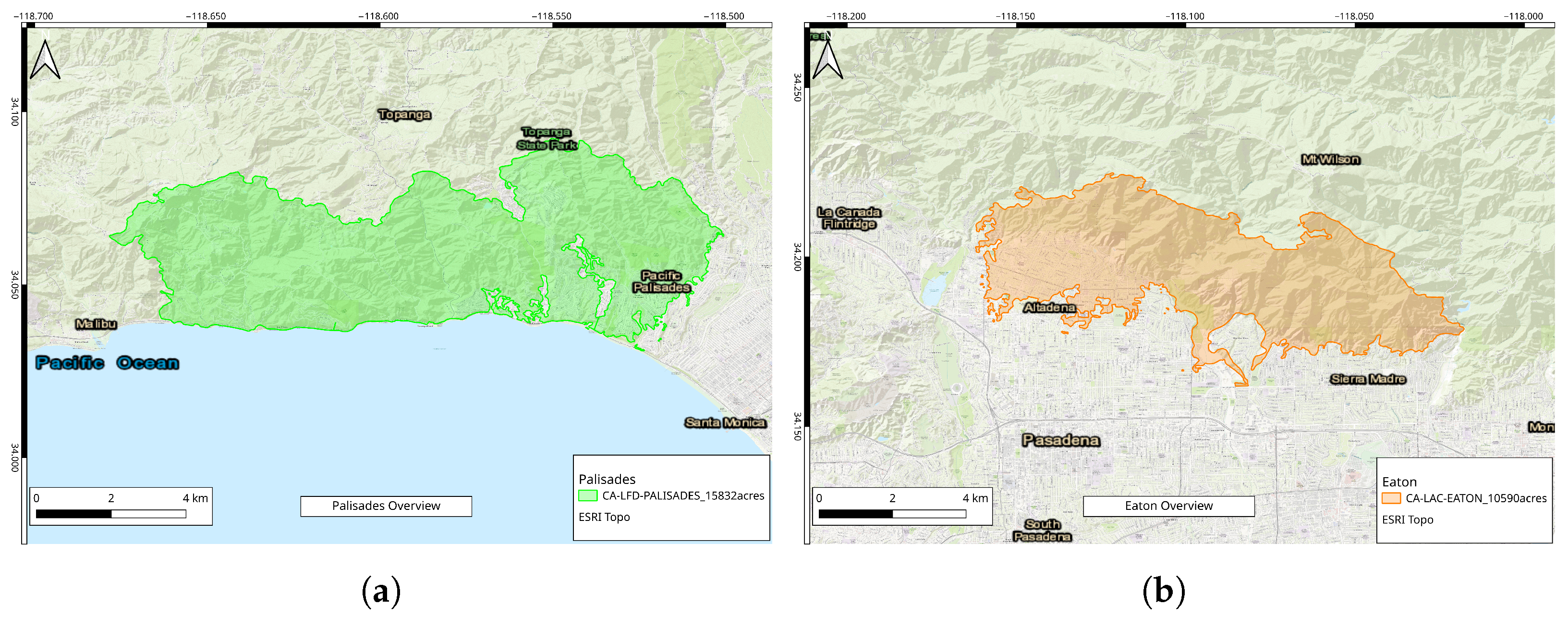 - Du, Y.N.; Feng, D.C. A rapid and quantitative post-wildfire damage assessment of buildings in the 2025 Palisades fire in California based on InSAR. Int. J. Disaster Risk Reduct. 2025, 129, 105809. [Google Scholar] [CrossRef]