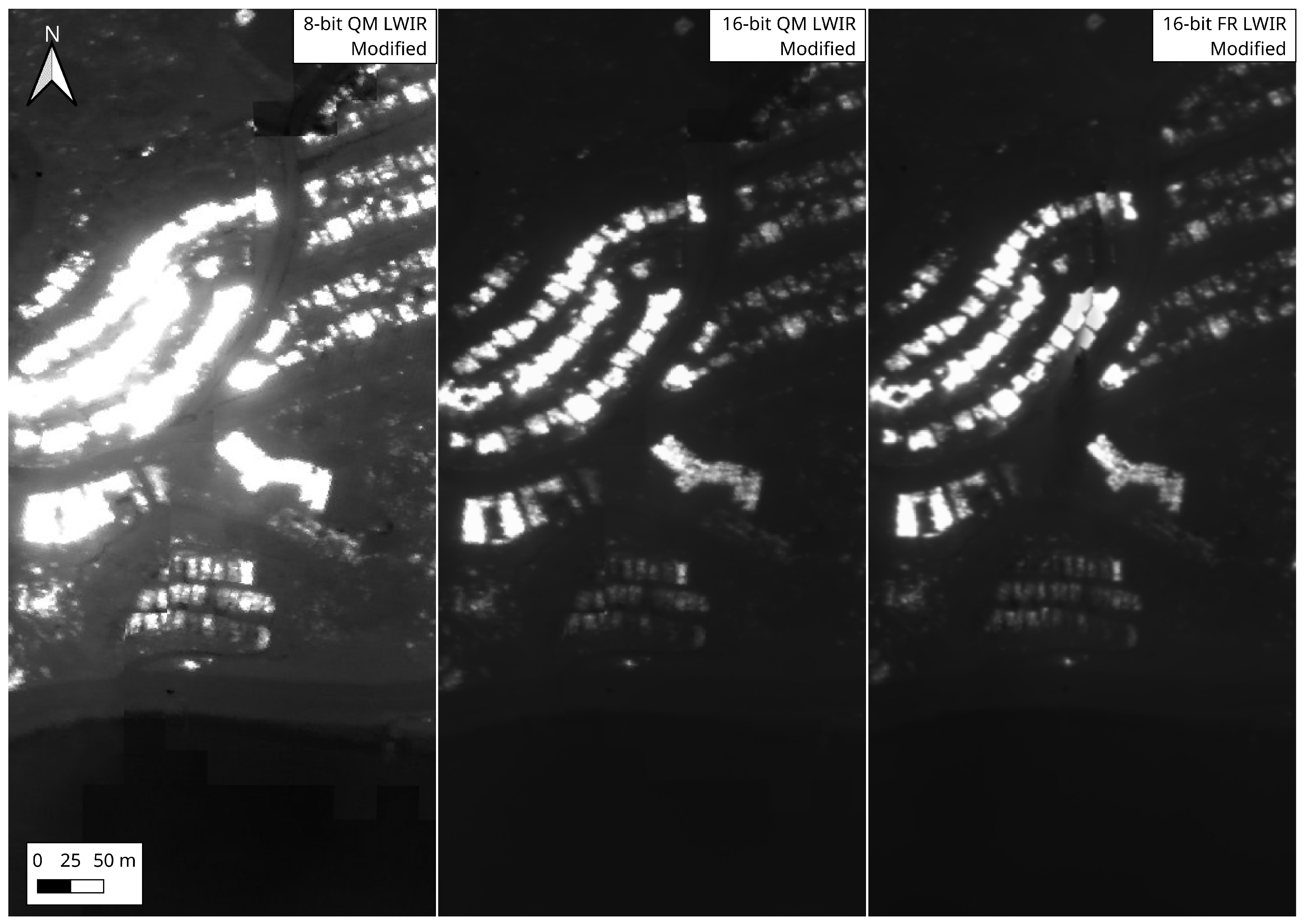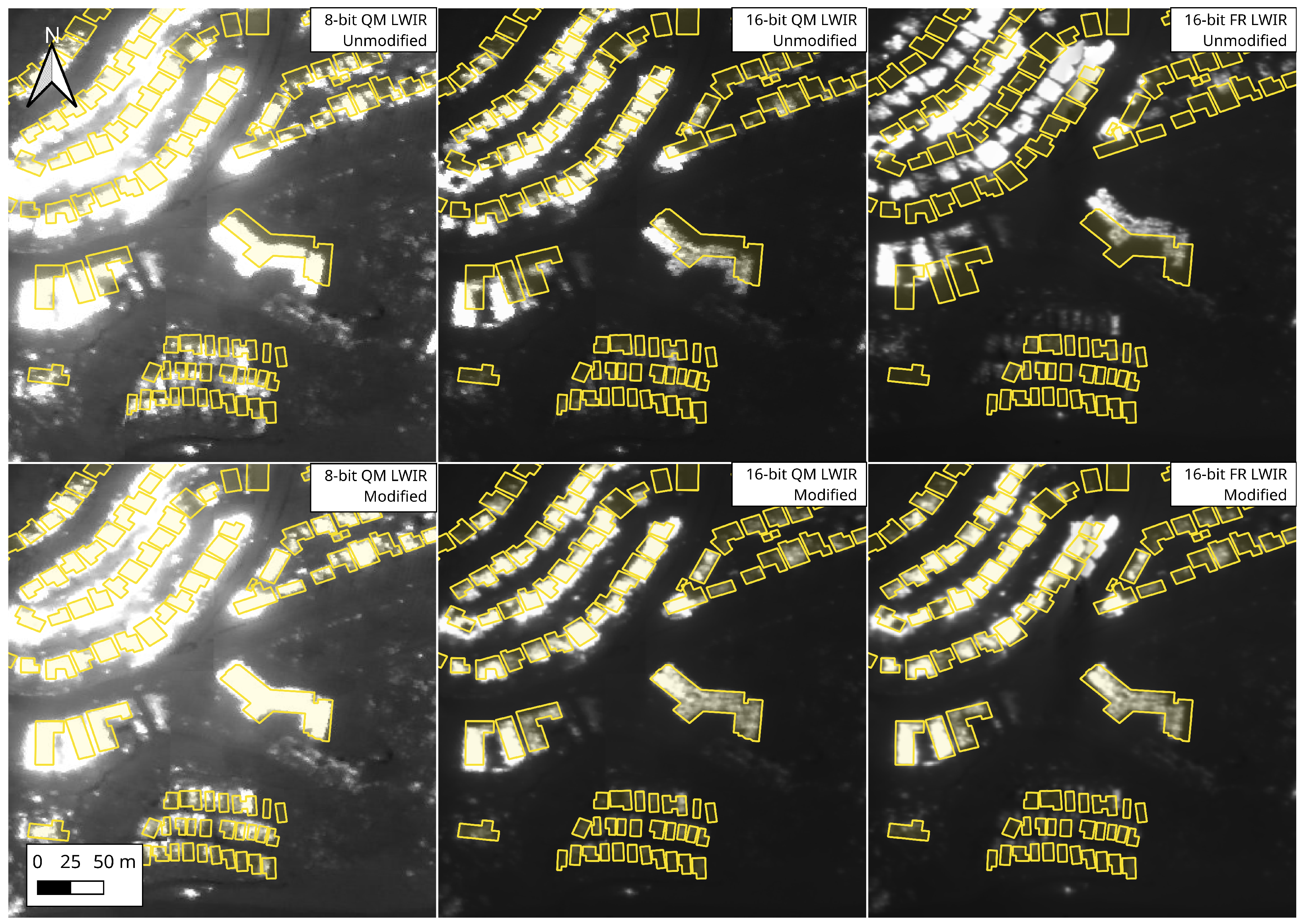 - Data Type: 16-bit vs. 8-bitThese experiments are designed to evaluate the impact of radiometric resolution on classification performance. The initial default is the 8-bit Quick Mosaic, which is efficient for storage, faster to process, and easier for humans to inspect when analyzing thermal signatures in damaged buildings. The 16-bit Quick Mosaics preserve the full range of sensor intensity values, capturing subtle variations in thermal response that may be important for accurately distinguishing damage levels [28]. In contrast, the 8-bit products, while easier to store and interpret, may lose some of these fine details that a machine learning model could use. This experiment evaluates whether the extra computational and storage cost of 16-bit mosaics is justified by improvements in model performance.