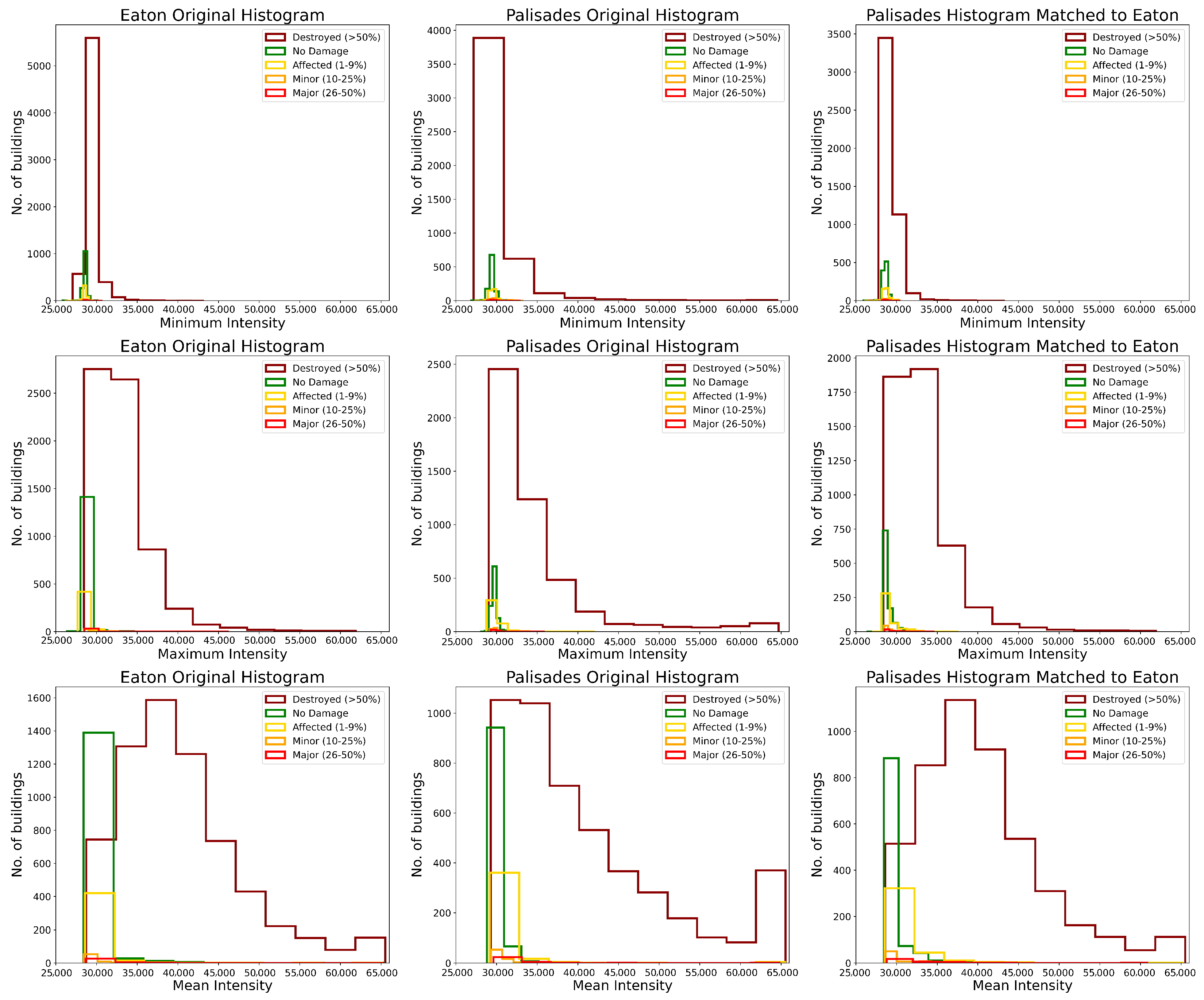 - And/or differences in the time of day the imagery was collected and its global effect on intensity values, particularly where the low-intensity damage thresholds separating burning structures and objects at elevated fire-warmed and ambient temperatures increasingly overlap.