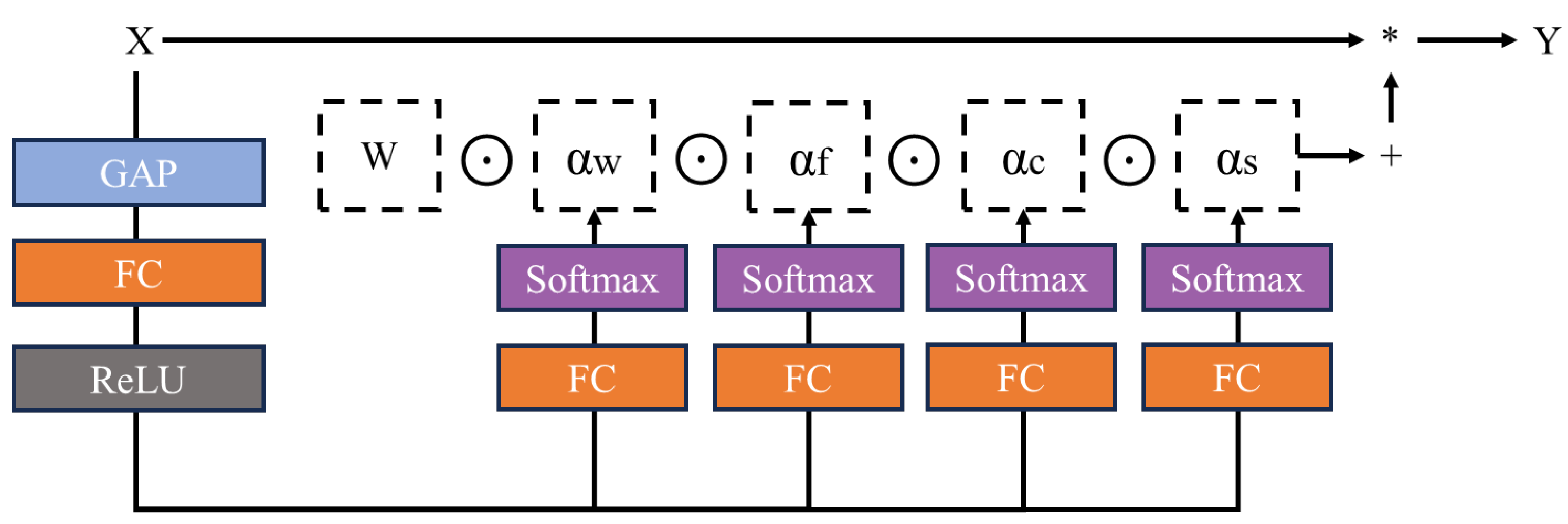 Filter-wise Attention: this step is a multiplication operation along the filter dimension to adjust the convolutional weights of each output channel.