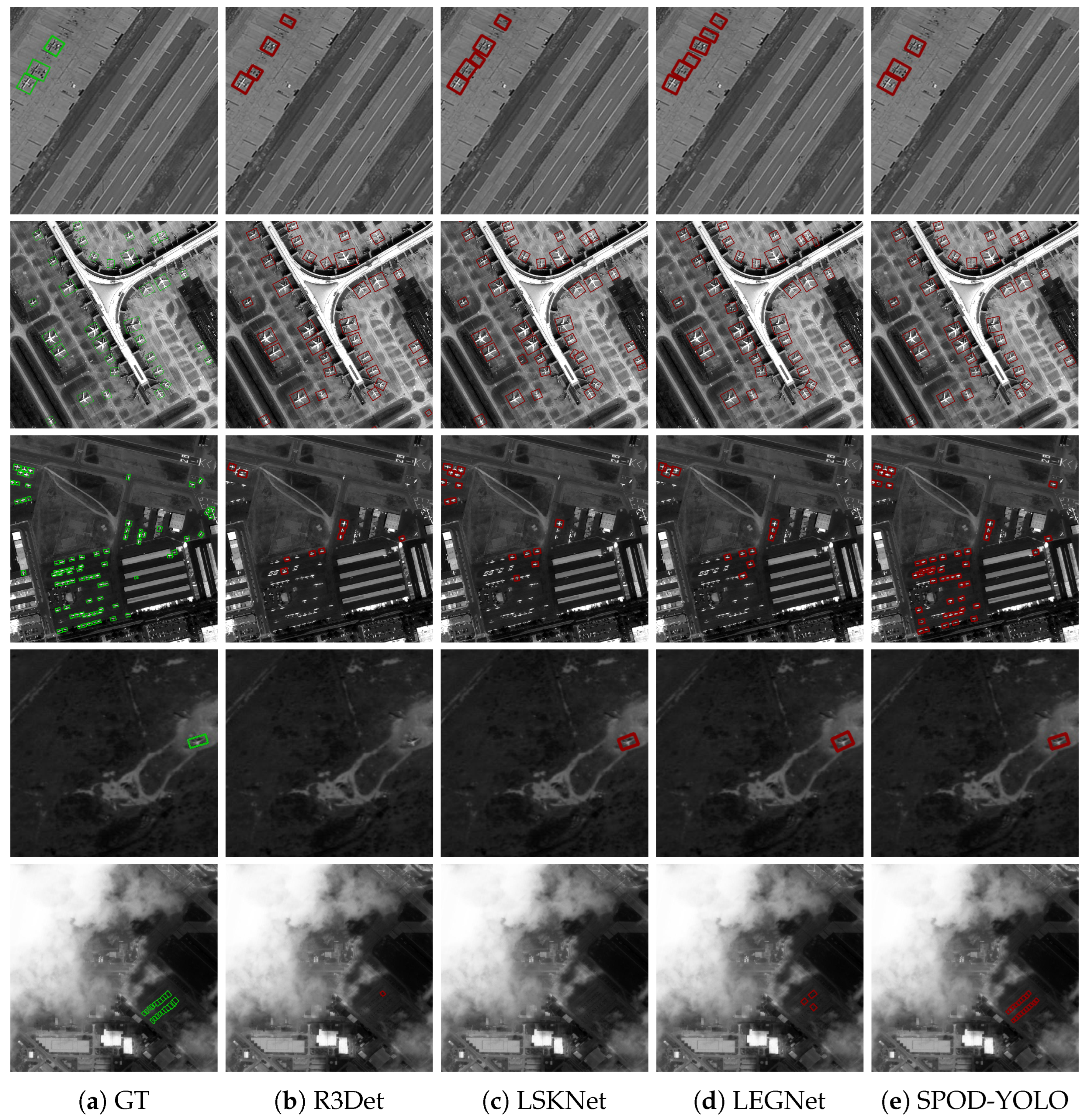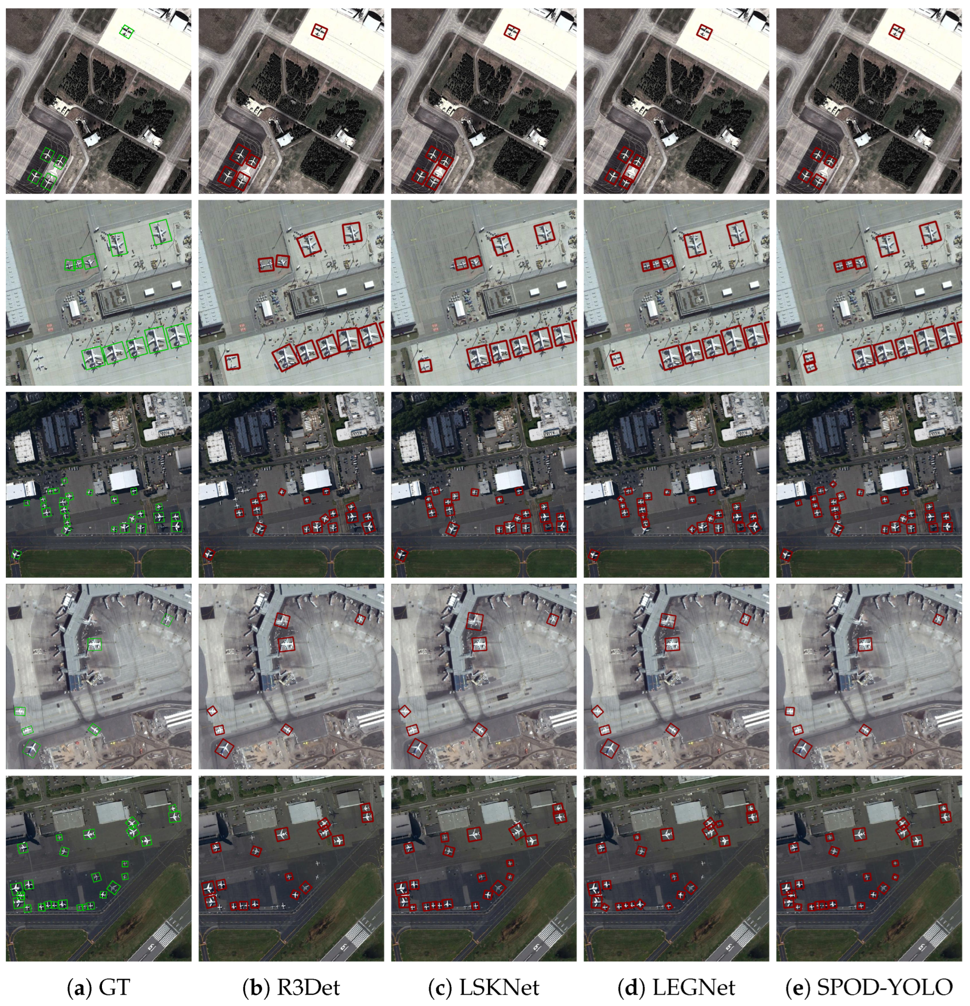 In remote sensing imagery, particularly in typical scenarios such as airports, aircraft often exhibit strong directional consistency and dense spatial distributions. In such scenes, traditional object detection methods that employ HBB face critical limitations. Due to the intrinsic orientation of aircraft, horizontal boxes fail to tightly enclose object boundaries, resulting in significant redundant background regions. This issue becomes more pronounced in dense scenes, where multiple HBBs tend to overlap extensively, severely impacting the performance of non-maximum suppression (NMS). These overlaps often lead to increased false positives and missed detections. In contrast, RBB detection can align with the principal axis of objects, providing more compact and precise enclosures. This alignment alleviates bounding box collisions in high-density areas and enhances detection robustness under crowded conditions.