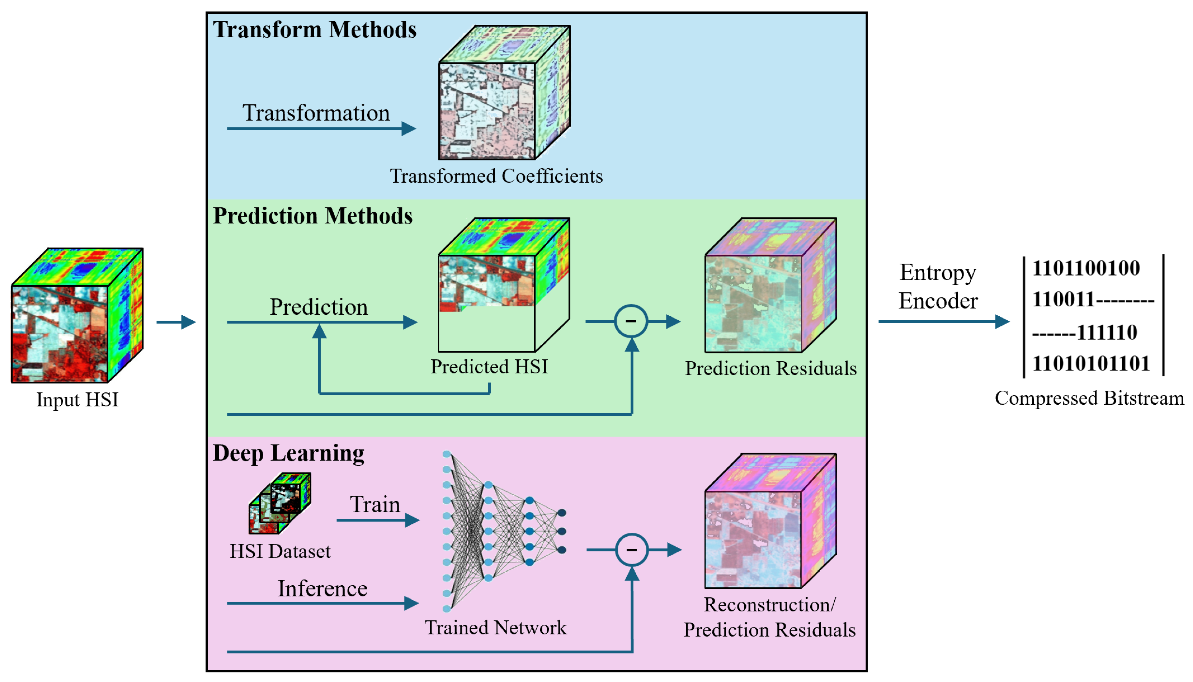 - The review provides a focused and systematic analysis of lossless hyperspectral image compression, categorizing existing algorithms into transform-based, prediction-based, and deep learning-based methods.