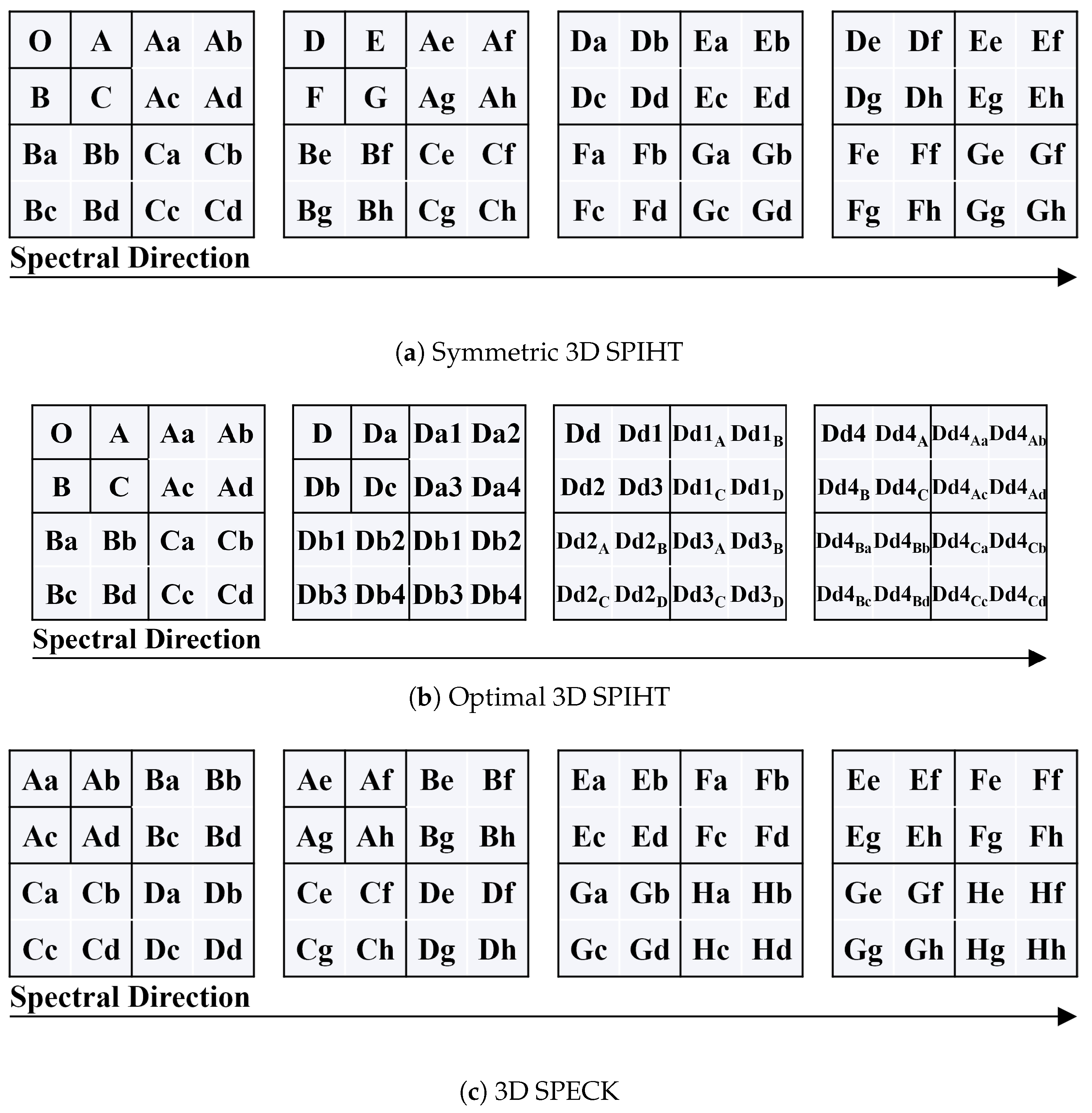 - Set Partitioning Embedded Block: The aforementioned scanning orders utilize the spatial and spectral consistency of wavelet coefficients, where coefficients derived from the same set of pixels tend to have similar magnitudes. In contrast, SPECK [23] leverages sub-band consistency, where coefficients within the same sub-band exhibit similar magnitudes. This leads to a different hierarchical structure, as depicted in Figure 3h. If all coefficients with identical initial indices, such as “Ba” to “Bh”, are insignificant, they can be encoded as a single output. The 3D extension of SPECK is done by grouping wavelet coefficients into 3D cubes instead of 2D blocks, as illustrated in Figure 4c. It is noteworthy that the concept of 3D SPECK can be applied to non-wavelet coefficients as well, such as the k2-raster coding method in [27]. Besides, SPECK can be further enhanced by ZM-SPECK [28], which reduces the memory requirements while encoding.