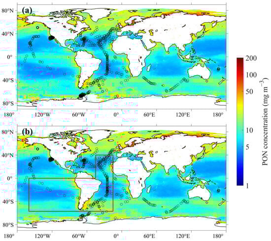 Geographical distributions of matchups of (a) in situ PON measurements, MODIS-Aqua data, and physics reanalysis dataset, and (b) in situ PON measurements and MULTIOBS products. The background map illustrates the global oceanic distribution of surface PON concentrations retrieved by the XGBoost retrieval model. The red frame delineates two regions: the region within 0–57°S and 15–160°W, and the region within 0–40°N and 15–45°W.