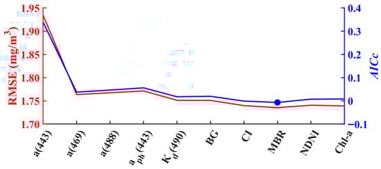 Variations in the RMSE and AICc with the number of elected features in XGBoost PON modeling for MODIS-Aqua. The features are ranked based on their importance.