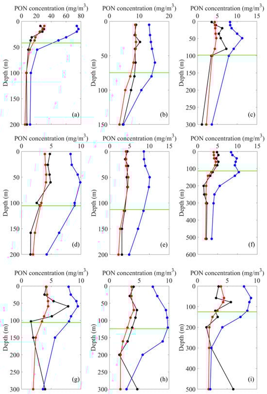 Although many vertical PON profiles displayed a Gaussian-like structure with a subsurface maximum, this pattern was not universal. Some profiles (Figure 9a–c) showed a monotonic decrease with depth, with only minor variability in the upper ~10 m. Even in profiles exhibiting a Gaussian-like peak (Figure 9d–i), PON concentrations were generally low, with vertical differences typically less than 2 . Nevertheless, these deviations did not compromise the effectiveness of Gaussian regression in estimating PON stock within the euphotic layer.