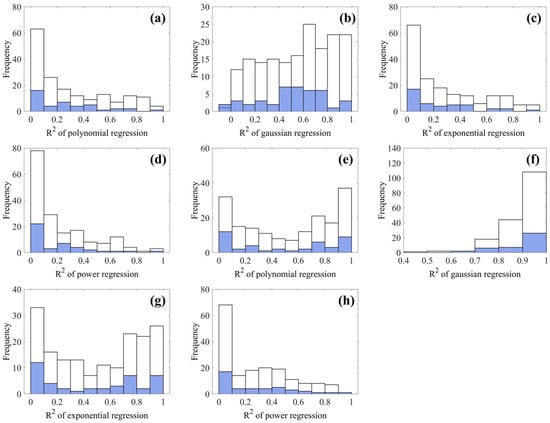 Figure 8 presents the distribution histograms of corresponding , with panels (a–d) representing in situ profiles and panels (e–h) showing XGBoost-estimated profiles. Among the regression models, Gaussian regression consistently provided the highest values of for both in situ and XGBoost-estimated datasets. In contrast, the polynomial, exponential, and power-law models exhibited predominantly lower values of , mostly concentrated below 0.5 (Figure 8a,c,d,h). Although a subset of XGBoost-estimated profiles displayed moderately higher values of under polynomial and exponential models (Figure 8e,g), a large part of remained below 0.4 and performed significantly worse than Gaussian fits (Figure 8f).