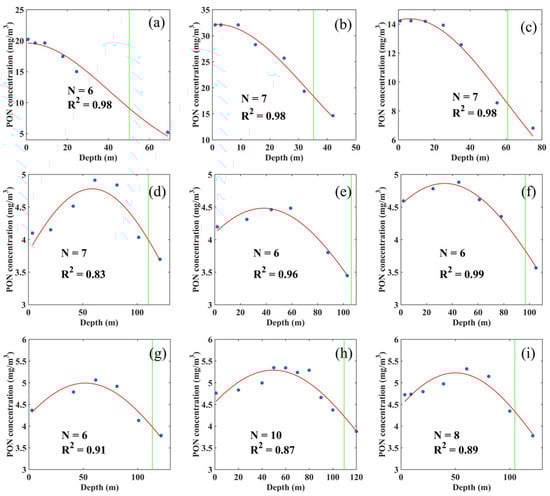 Gaussian regression of XGBoost-estimated PON vertical profiles from the surface to 20 m below the base of the euphotic zone at the following locations: (a) 67.51°S, 70.59°W; (b) 53.35°S, 60.23°W; (c) 10.58°N, 64.68°W; (d) 27.54°N, 57.26°W; (e) 31.55°N, 31.33°W; (f) 35.69°N, 25.81°W; (g) 22.67°N, 65.51°W; (h) 30.68°N, 64.71°W; (i) 31.66°N, 64.12°W from the validation dataset. The blue solid dots represent the XGBoost-estimated PON concentrations, the red curves show the Gaussian regression fits to the XGBoost-estimated PON profiles, and the green vertical lines represent the base of the euphotic zone.