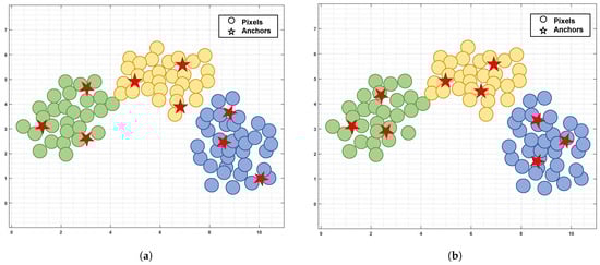 To tackle this problem, more efficient dictionary learning algorithms have been proposed [24,25,26]. Instead of using the entire HSI data as a dictionary, Huang et al. learned a smaller dictionary based on the random matrix and presented a large-scale SSC method [27]. Since the corresponding coefficients under the small-scale dictionary are diminished, the computational cost is accordingly lowered. To mitigate noise and spectral variability, it employs a total variation constraint on the coefficient matrix to consider the spatial dependence between adjacent pixels. In addition, Zhai et al. introduced a sketched reweighted sparse and low-rank subspace clustering, which effectively incorporated non-local spatial information through non-local mean regularization [28]. These algorithms have improved computational efficiency, but they select M anchors ( M N ) from N pixels via random sampling, which fails to guarantee the quality of anchors, resulting in unstable clustering performance. More importantly, such anchor selection strategies, inherited from machine learning, treat each pixel as an independent sample. During the selection process, they solely focus on the spectral features of pixels while ignoring the crucial spatial correlation in HSI, failing to select the satisfactory high-quality anchors. To incorporate the spectral–spatial characteristics of the pixels, superpixel-based anchor selection methods have gradually emerged [29,30,31]. Most of these methods generate homogeneous regions via superpixel segmentation and then produce representative points for these regions as anchors by weighted averaging all pixels within the same superpixel. While this strategy enhances clustering performance by incorporating spatial information, it disregards the distribution consistency between anchors and samples, resulting in the poor discriminability of anchors. As illustrated in Figure 1, the distribution consistency between anchors and samples critically affects the anchors’ representational quality. If anchor distributions deviate from pixel distributions, the anchors fail to represent samples effectively, which degrades anchor graph quality and further reduces the clustering performance.