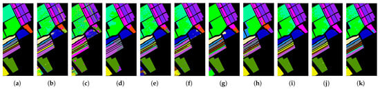 Figure 2. Clustering maps on the Salinas dataset. (a) GT. (b) FSCAG. (c) HESSC. (d) NCSC. (e) S3AGC. (f) BGPC. (g) SDST. (h) SSGCC. (i) SAPC. (j) HPCDL. (k) OUR.