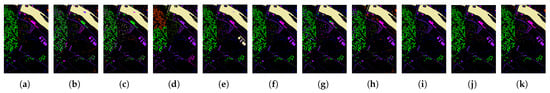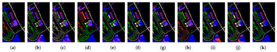 Figure 4. Clustering maps on the PaviaC dataset. (a) GT. (b) FSCAG. (c) HESSC. (d) NCSC. (e) S3AGC. (f) BGPC. (g) SDST. (h) SSGCC. (i) SAPC. (j) HPCDL. (k) OUR.