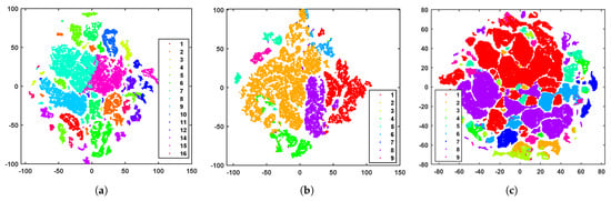 Figure 5. Visualization of the clustering results with t-SNE on the three datasets. (a) Salinas. (b) PaviaU. (c) PaviaC.