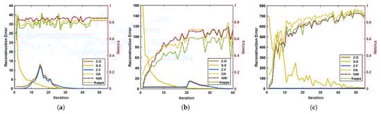 Figure 8. Convergence curves and clustering metrics curves on the three datasets. (a) Salinas. (b) PaviaU. (c) PaviaC.